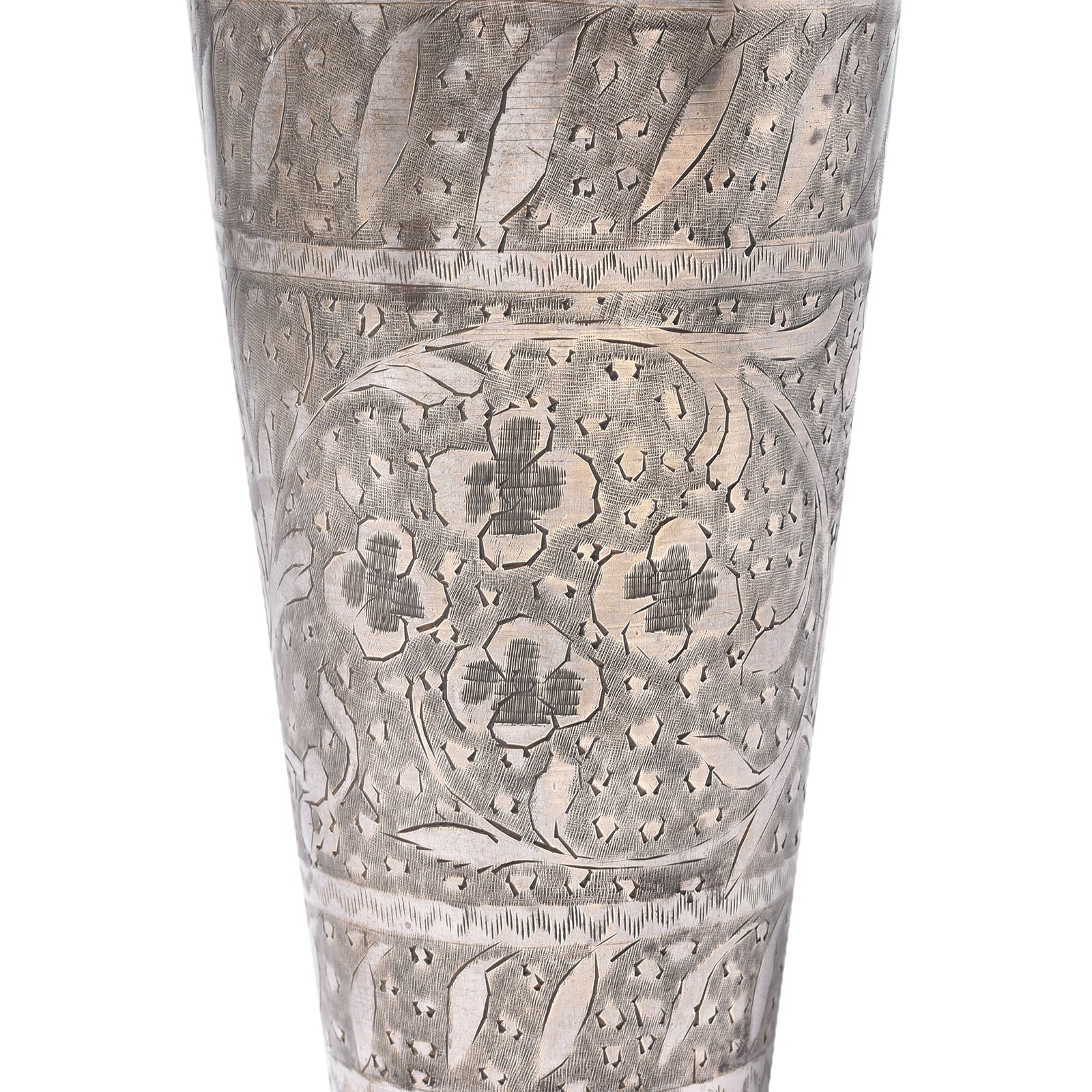 This old Indian lassi cup is from North India and made from nickel plated brass. Each one has its own hand etched designs. It dates to the early 20th century, circa 1920.