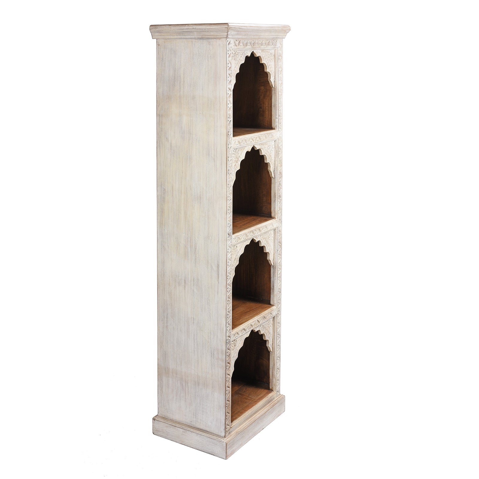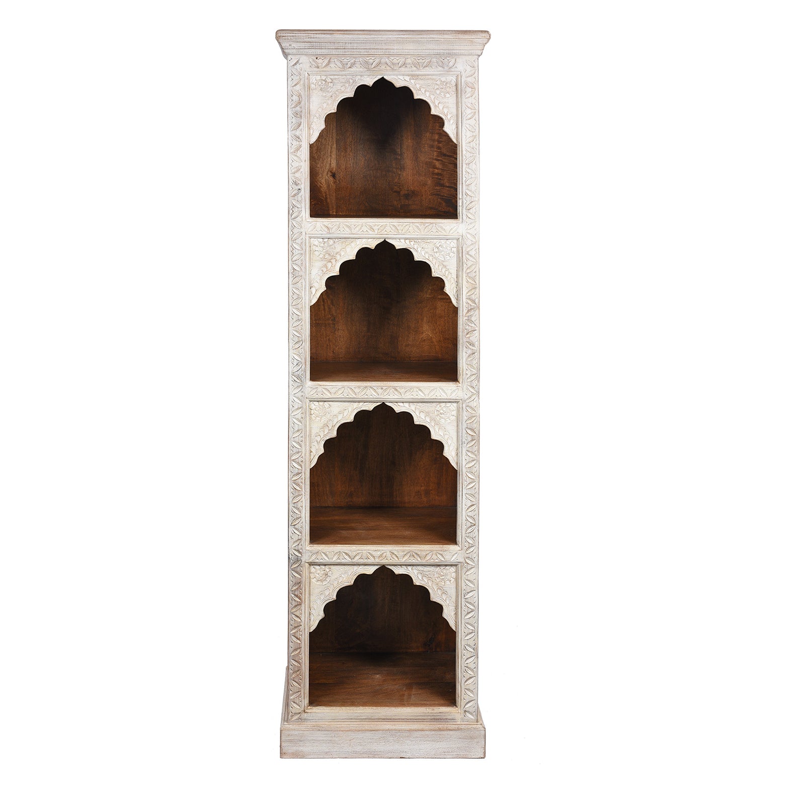This beautifully functional Indian shelving unit is newly made from sustainable mango wood in India in the traditional way by local artisans. Its beautiful carvings and Mughal arches frame deep recesses perfect for displaying books or ornaments.