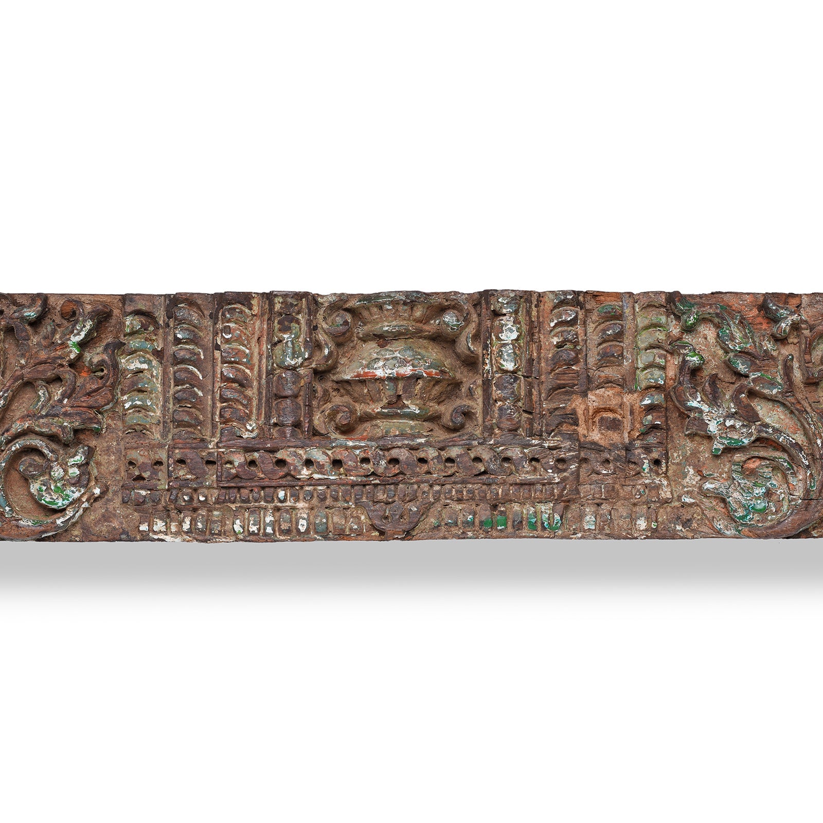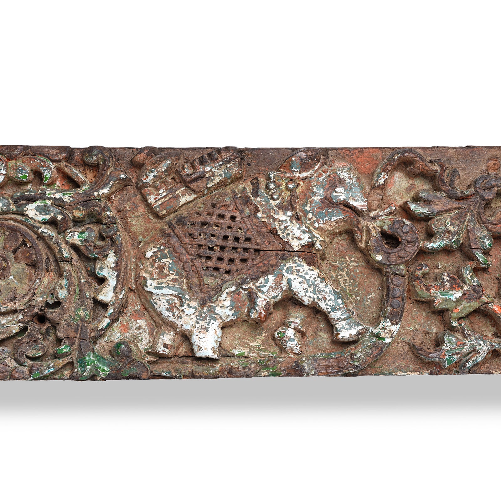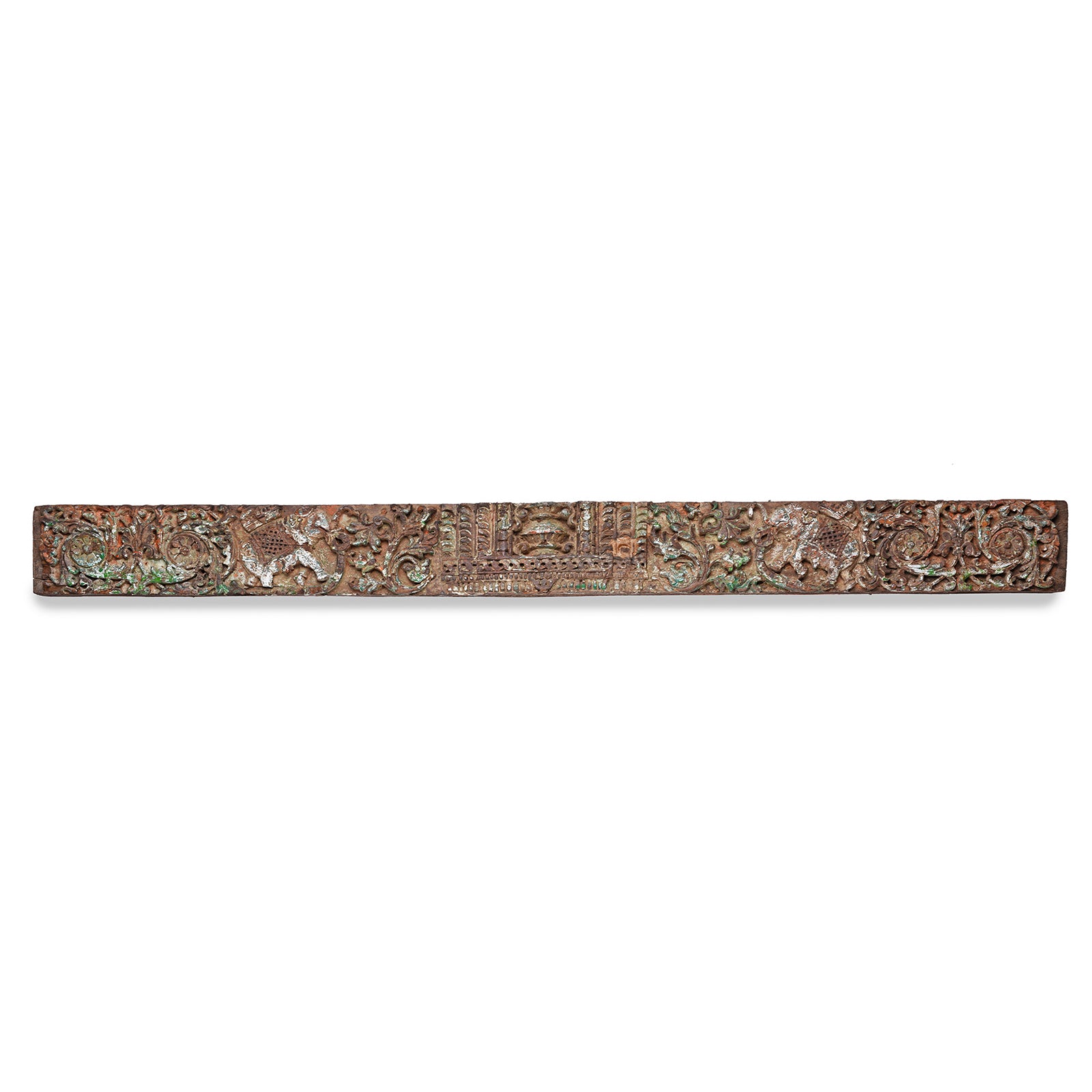 The elephants - ”symbols of wisdom, power, and protection - are beautifully rendered in shallow relief, framed by curling vines and leafy tendrils. Remnants of old green and white pigment highlight the carving's depth and enhance its weathered beauty.