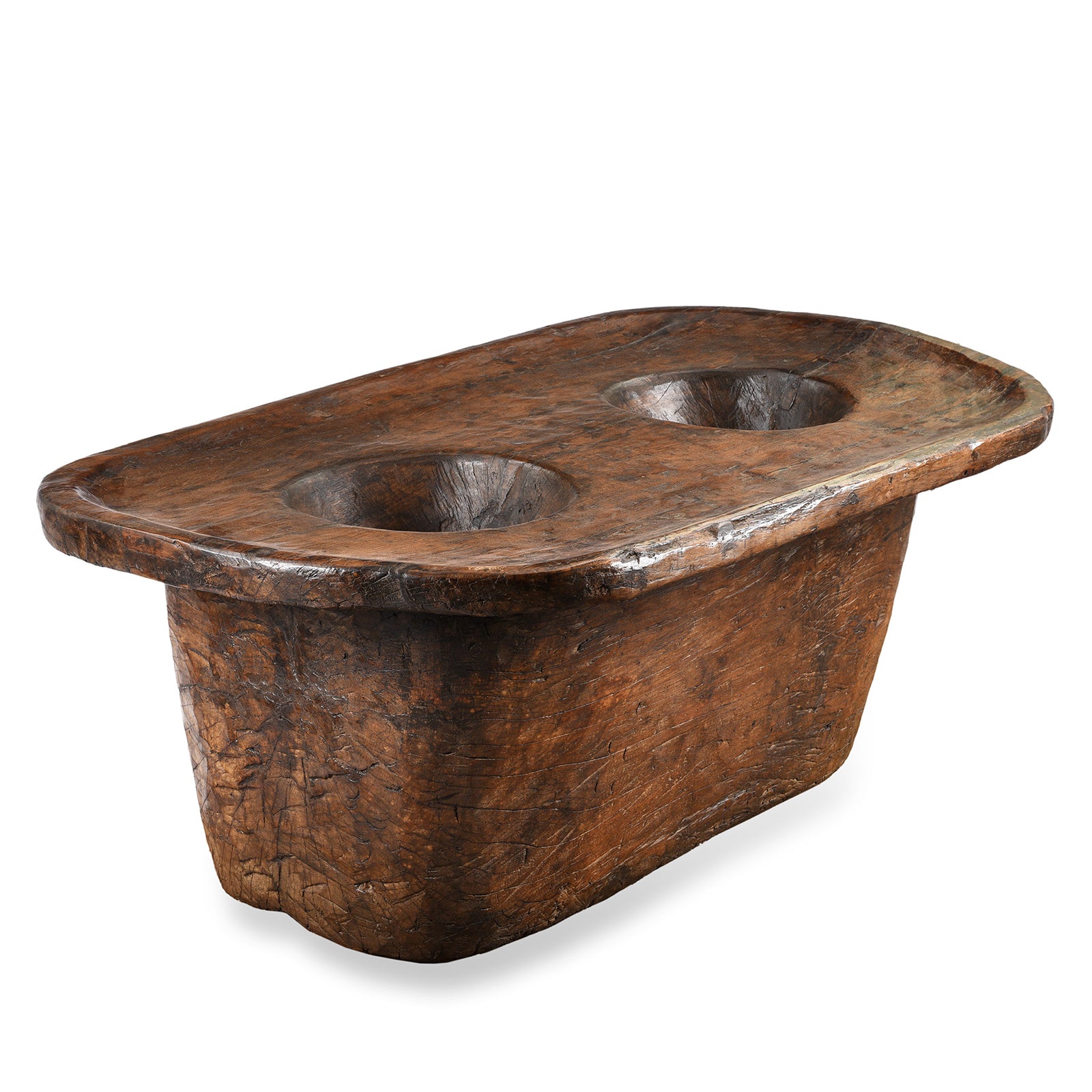 This old mortar is from Nagaland and in East India and was originally used for the pounding of grains. It is crafted from a single piece of solid teak wood. This amazing piece of timber would make an iconic statement piece coffee table. Over many decades of constant use, this piece has developed a smooth finish and rich patina. Mortars like this were in constant daily use and signs and wear and repairs are visible in places.