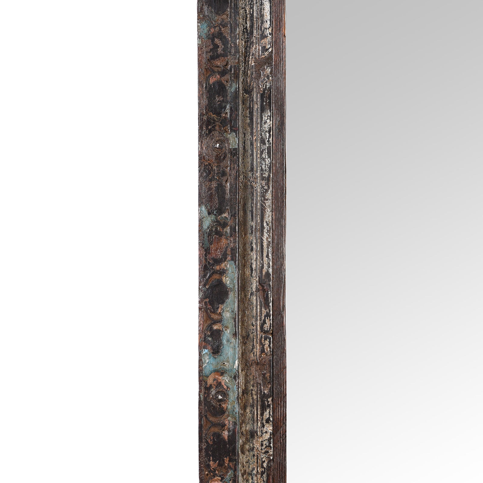 A simple carved mirror made from an old teak wood window from Nagaur in Rajasthan. The shutters have been replaced with mirror glass. The frame features geometric repeating patterns and old traces of paint blend into a wonderful rich patina.