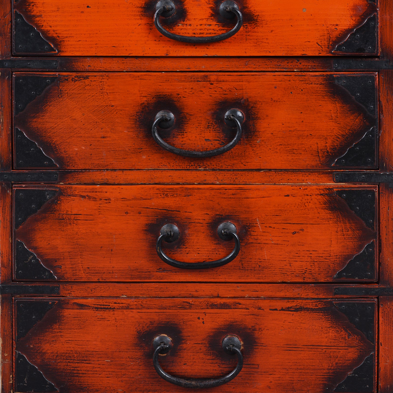 Originally made as a merchant’s chest, the compact proportions and four practical drawers reflect its functional purpose — designed to store documents, textiles or valuables within a shop setting. The bold red surface has developed a rich, time-softened patina, with gentle wear and variation that enhance its authenticity and character. The original black-painted iron fittings — including corner mounts, drawer pulls and protective hardware — provide a striking contrast against the lacquered ground while reinforcing the structure.