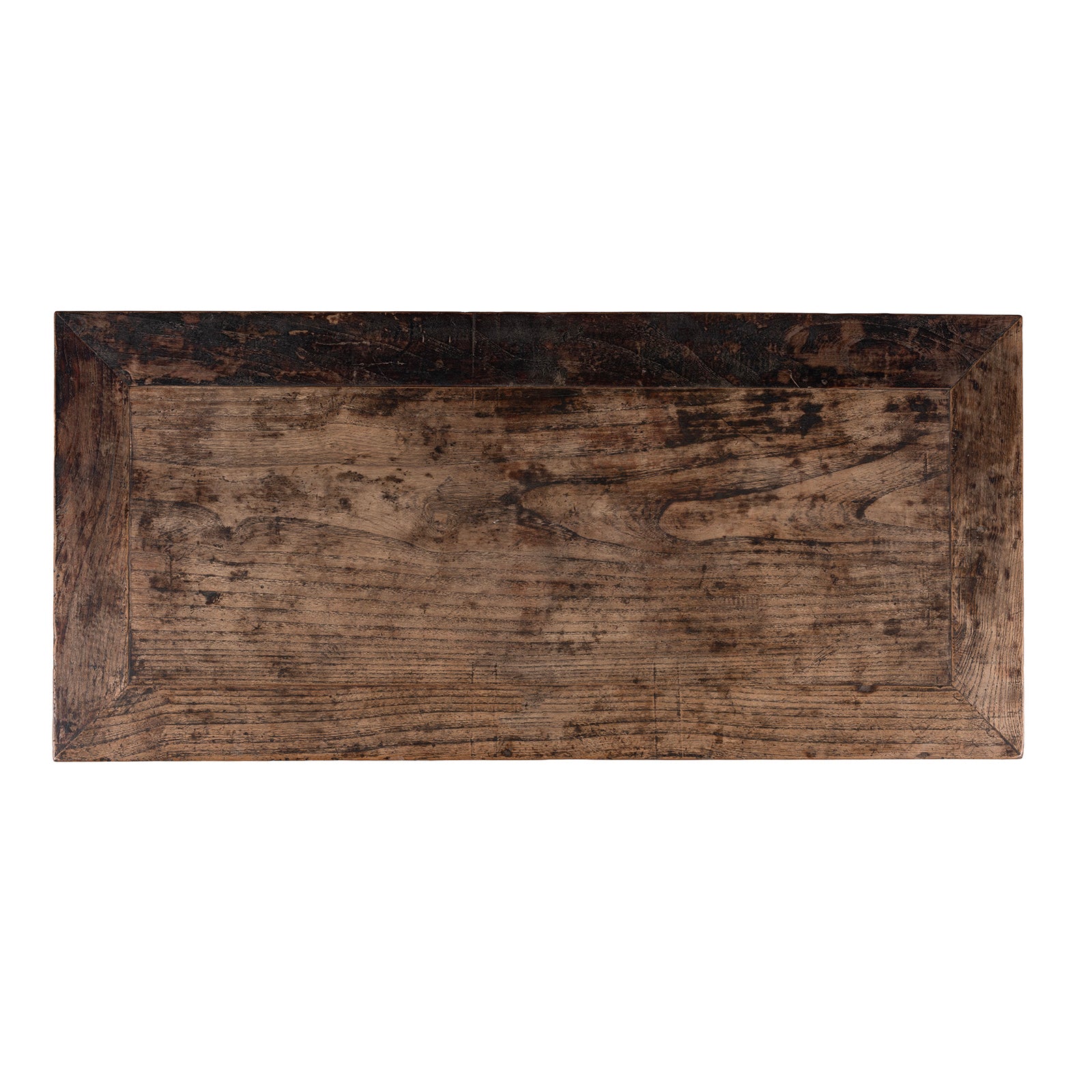 This original antique Chinese coffer table originates from Shanxi province and dates to the 19th century. Constructed from northern Chinese elm (yumu 榆木), it shows a timeworn surface with traces of its original burgundy lacquer, now mellowed into a warm patina that highlights the grain of the wood.