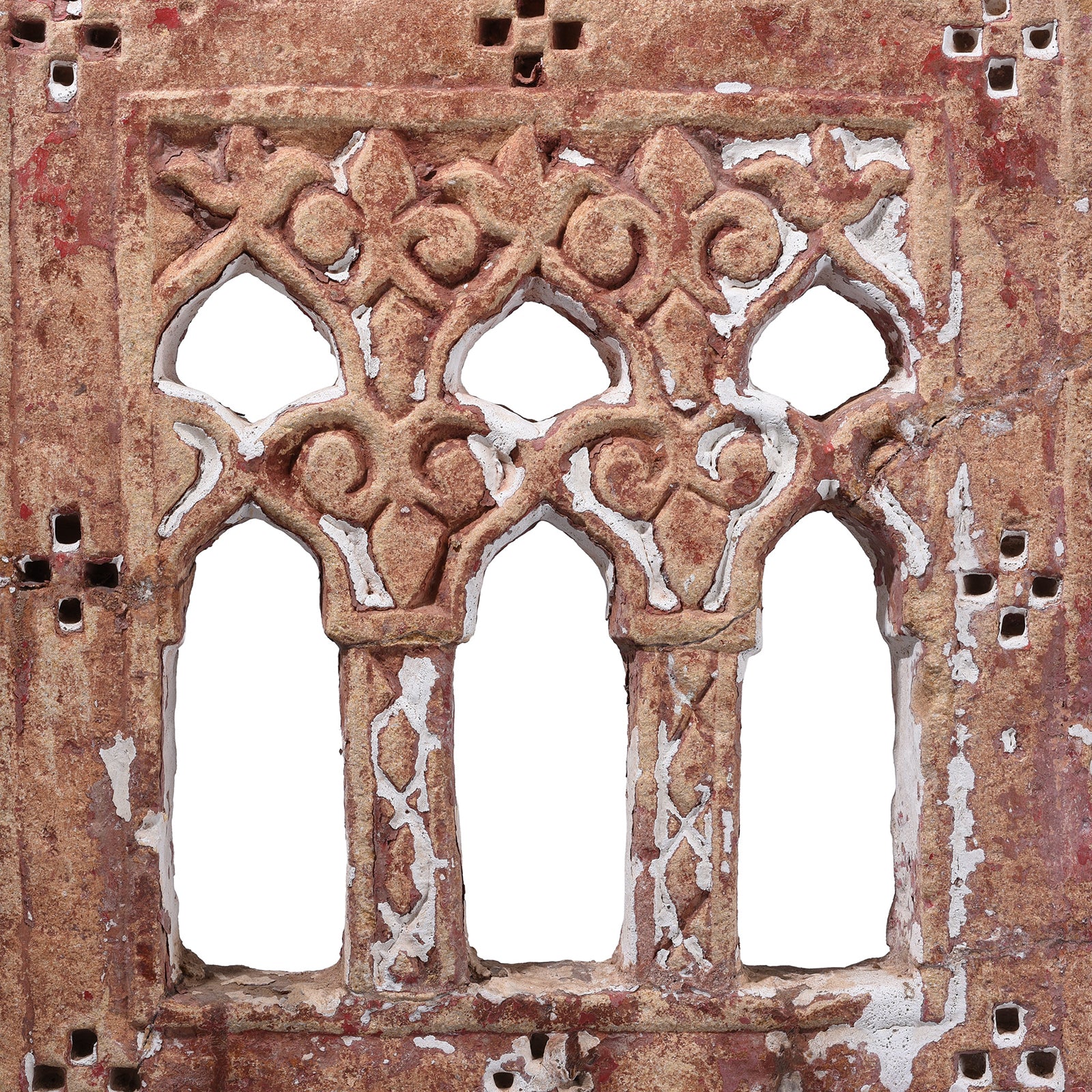 - Features: Three arched recesses, geometric and floral carving, remnants of old plaster and pigment