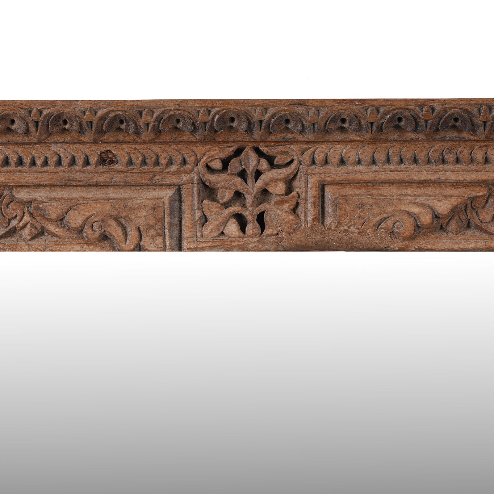 This beautifully carved roheda wood mirror has been created from an original 19th-century Shekhawati window frame, sourced from the historic desert region of Rajasthan. Shekhawati is celebrated for its exceptional Mughal-influenced carving traditions, and this frame displays that heritage through its finely hand-carved foliate borders, scrolling tendrils and delicate pierced motifs. The natural warm tone of aged roheda wood enhances the depth of the carving, giving the piece a wonderfully subtle, time-softened presence.