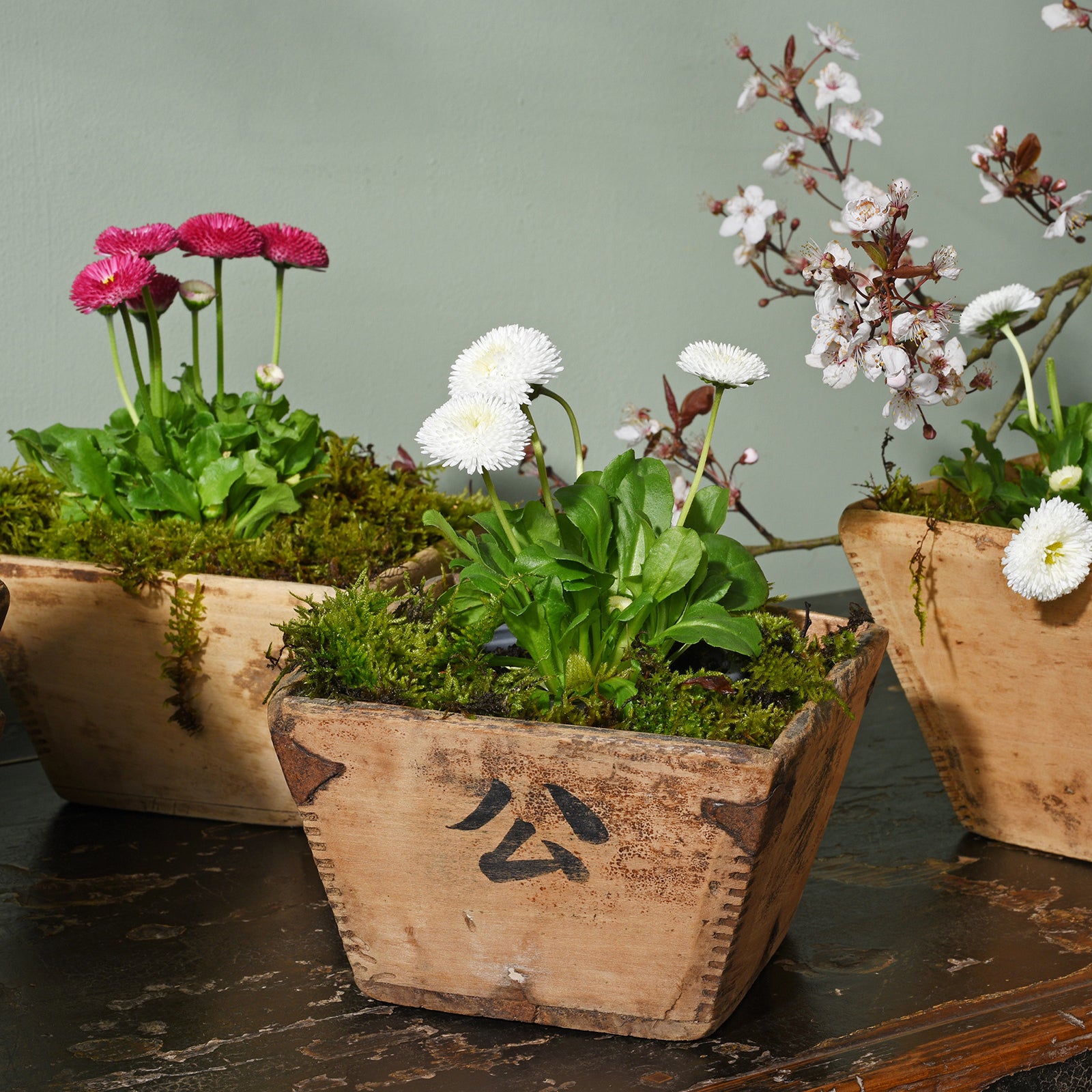 These old Chinese grain measures were used in markets for measuring grain, rice and wheat in Shanxi province, Northern China. They are made from poplar wood and show all the signs of well looked after practical objects. They would make fantastic flower pots or storage pots for a rustic interior.