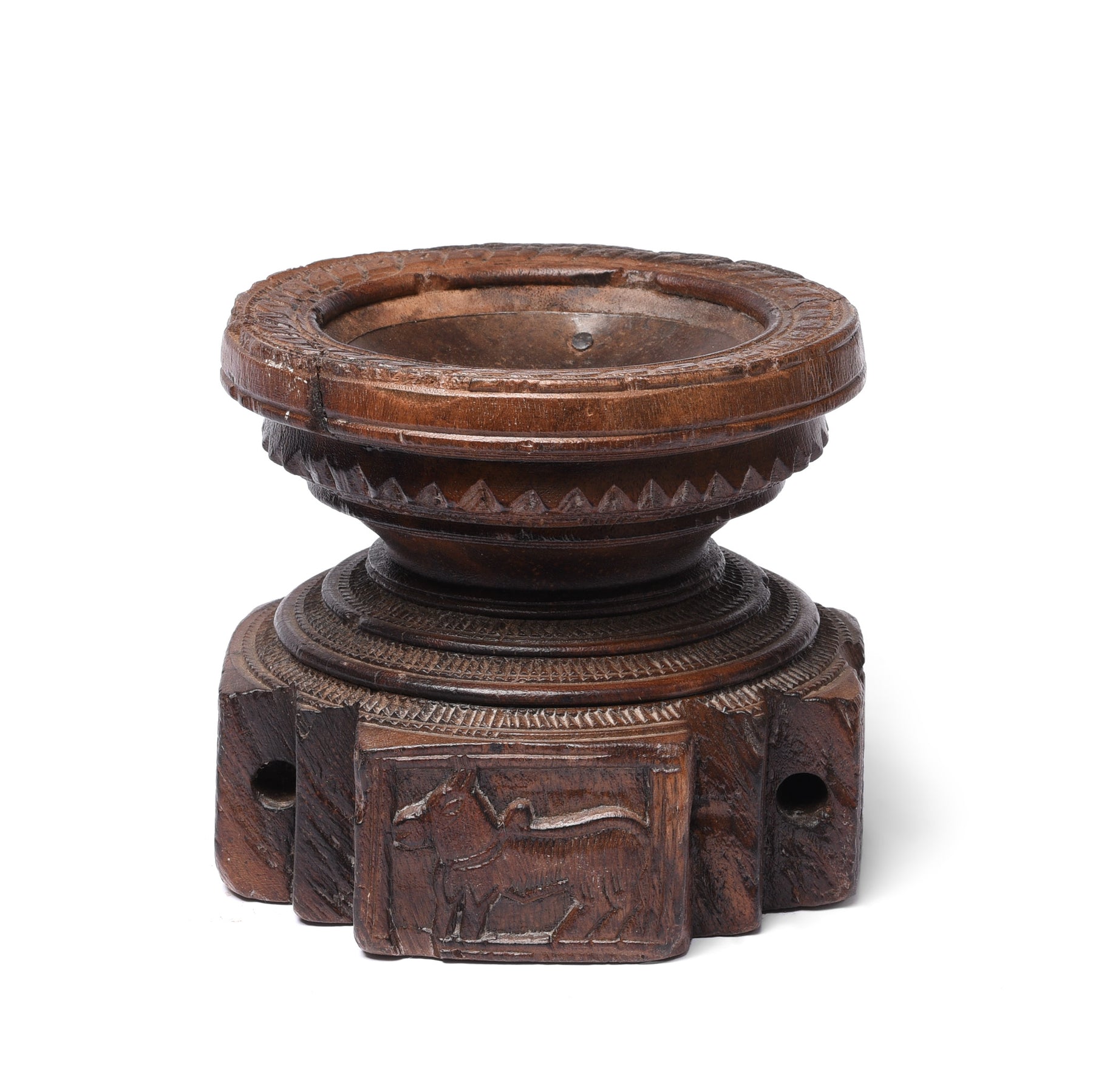 Like many things in India, seed drills were made for a practical purpose - beautifully carved by craftsmen in the 19thC who often embellished their tools with carved images of Nandi bulls and other favoured deities. Now they are no longer needed for farming an iron candle spike has been added to make a perfect candle stand.