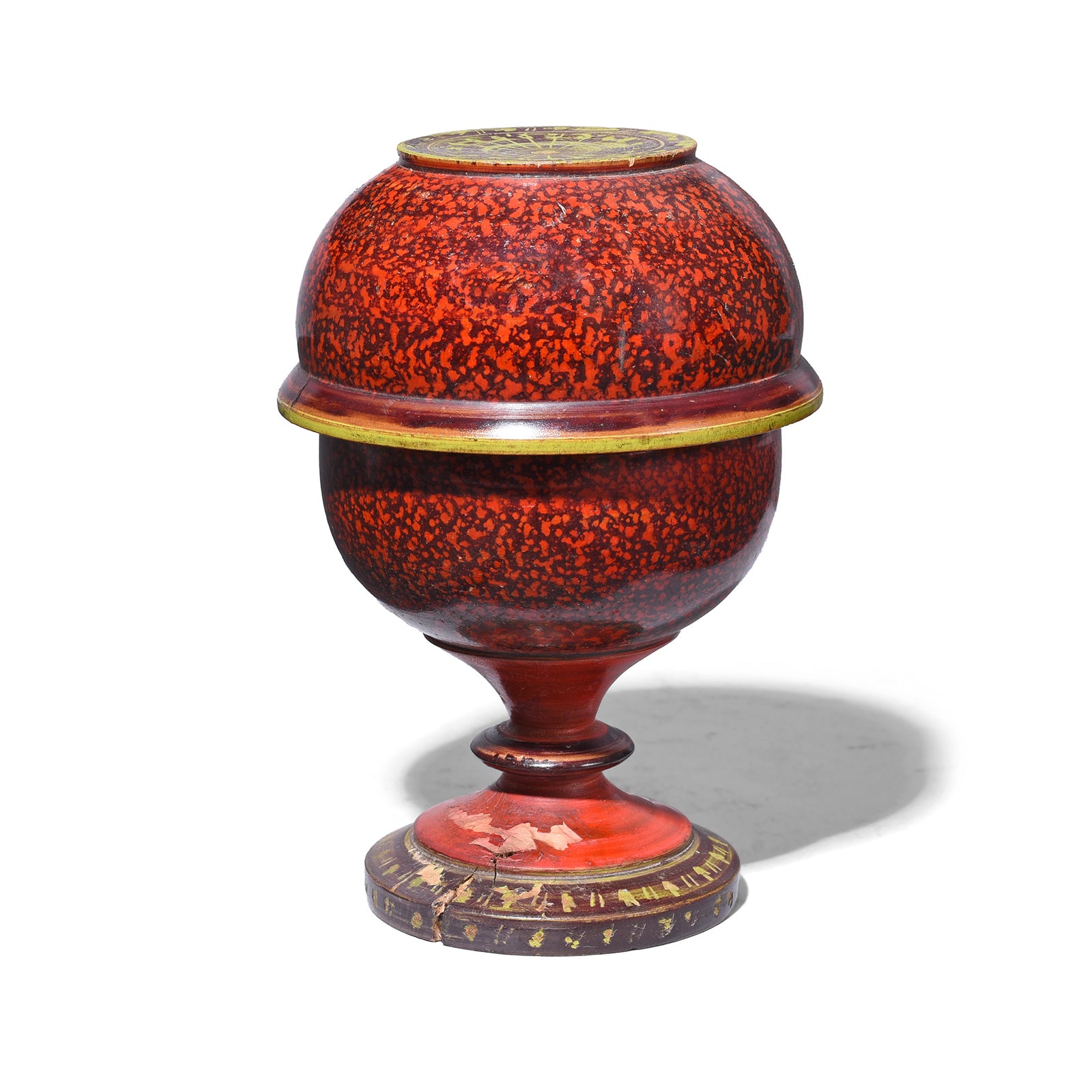 - Features: Two-part spotted lacquer pot with pedestal base, green interior, hand-lathed decoration