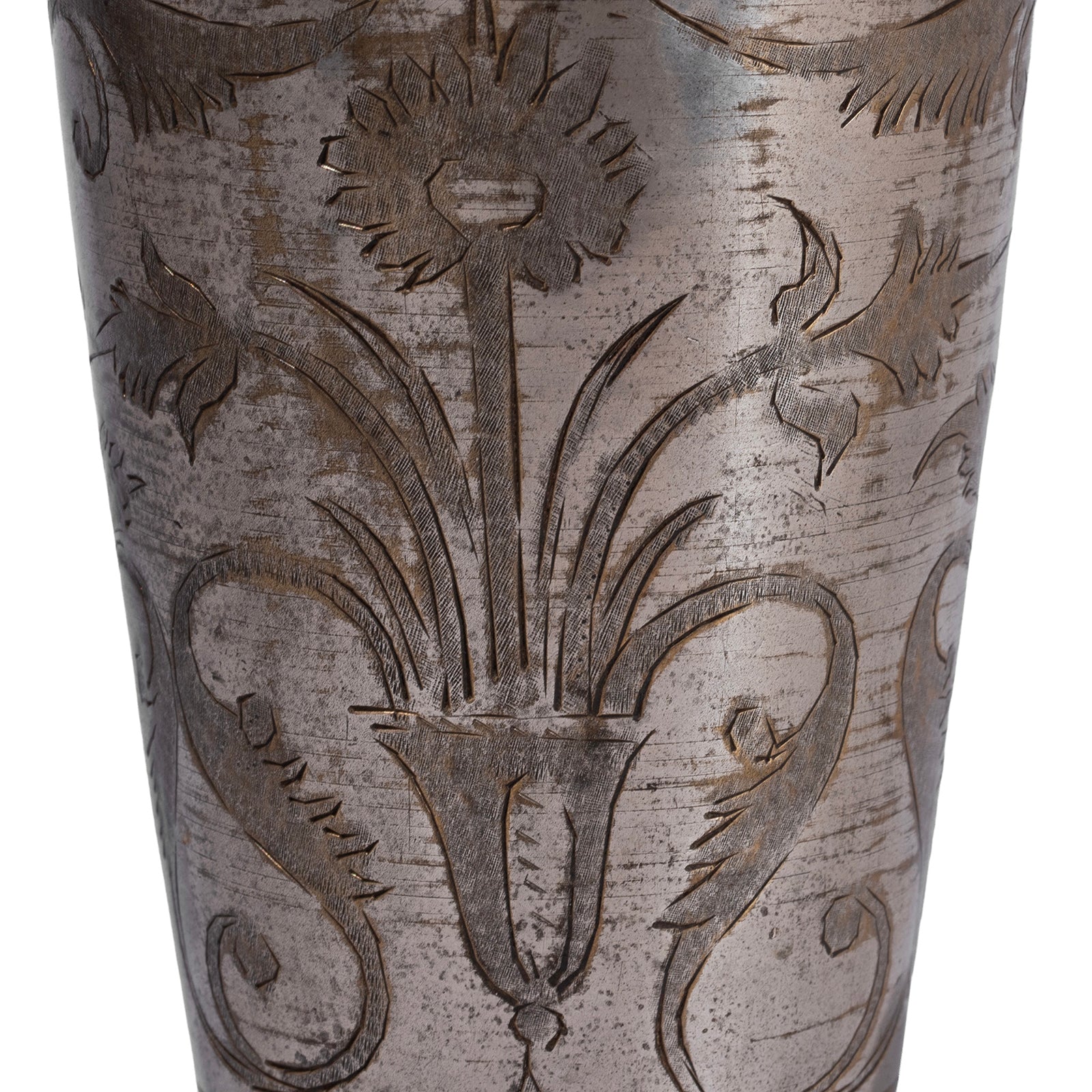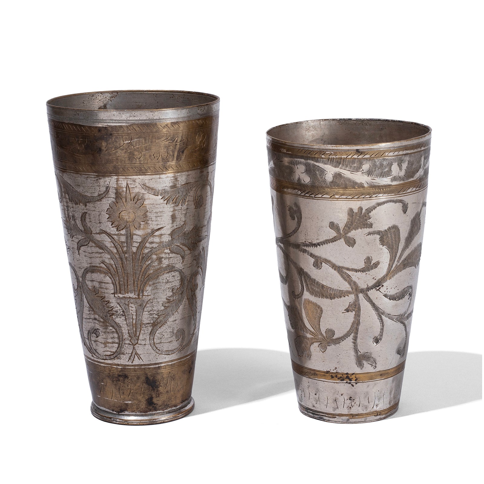 This old lassi cup from North India is made from nickel-plated brass, featuring a beautiful hand-etched floral design. Each cup is unique, reflecting the skill and artistry of the craftsman who created it. Traditionally, lassi — a cooling yoghurt-based drink — was served in cups like this, especially during festive occasions such as Holi, when it was sometimes infused with bhang (a traditional cannabis preparation).