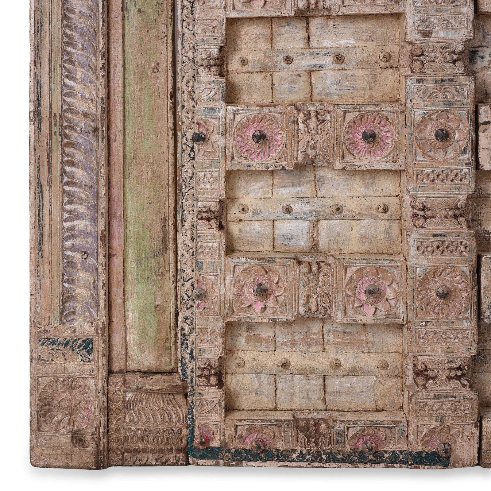 This exquisitely carved antique door hails from Surat, Gujarat - one of India's oldest port cities and a long-standing centre of artisanal craftsmanship. Dating to the 19th century and made from solid teak, the door is richly embellished with deeply carved floral medallions and foliate motifs, each hand-finished with care and imbued with symbolic meaning. Traces of original pink, green, and lilac polychrome paint soften the sculptural detail, lending the piece a faded elegance and quiet vibrancy.