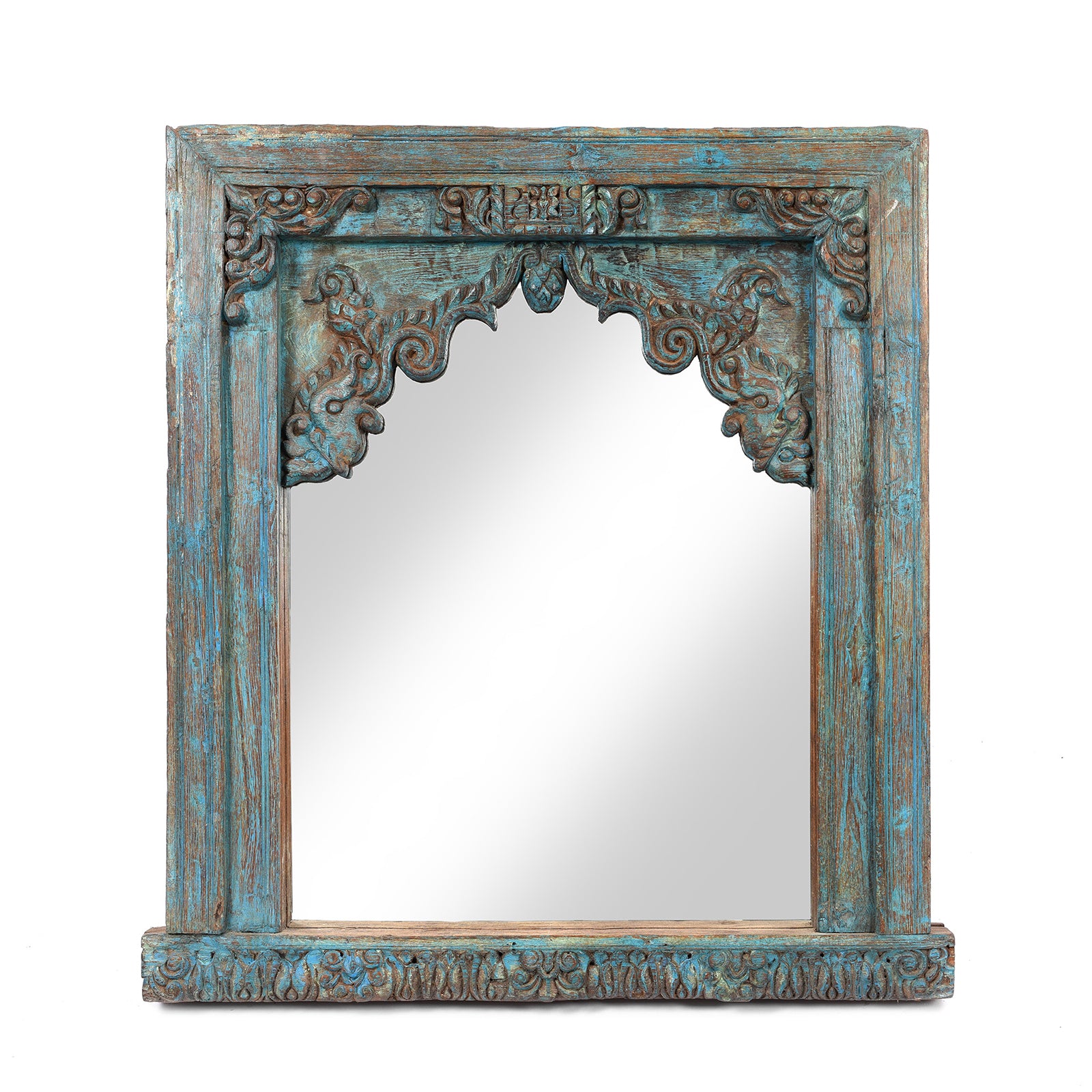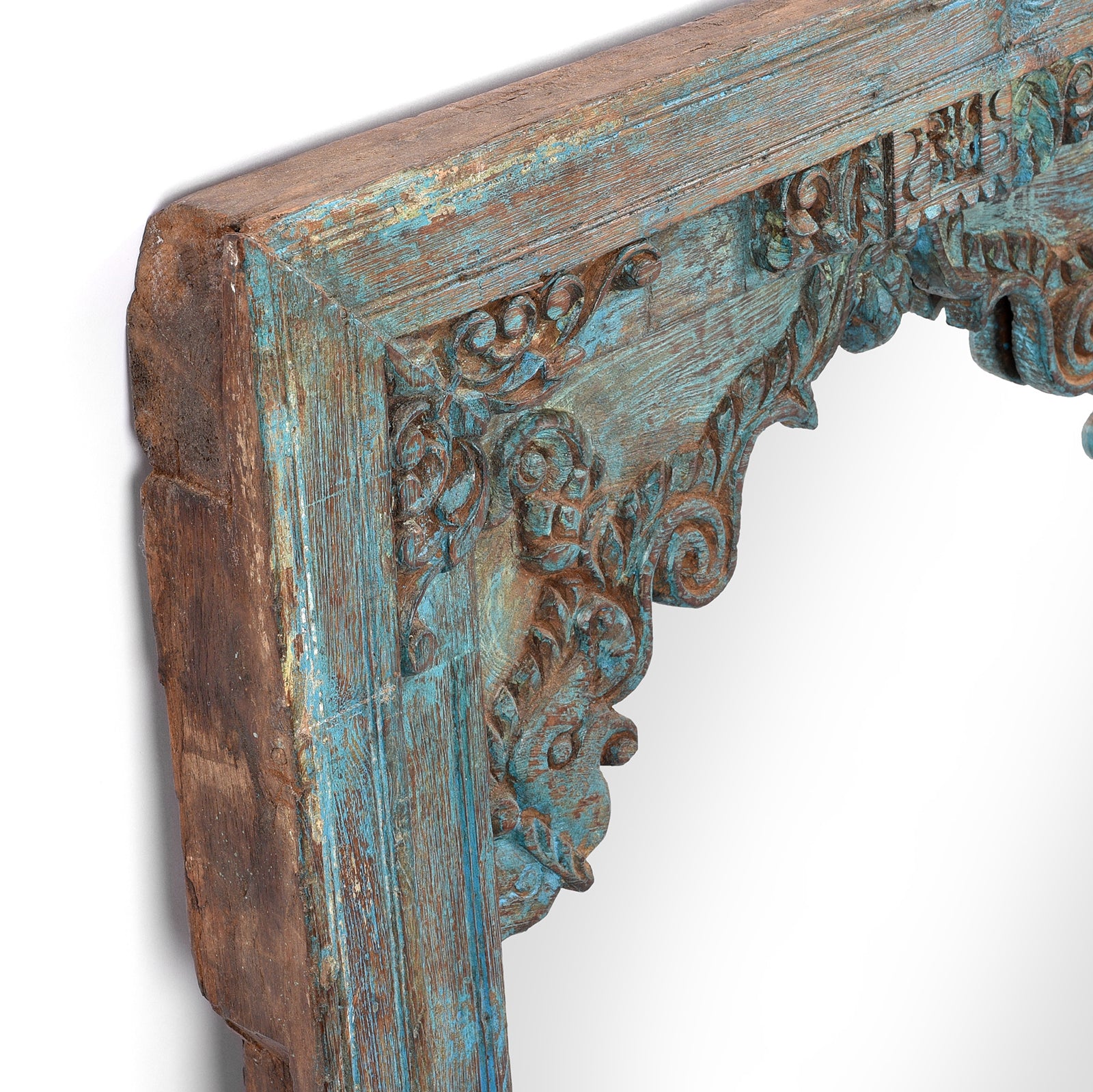 This mirror is made from an old carved teak wall niche & comes from the Banswara district of Rajasthan. This piece has been modified to use as a mirror or as a simple piece of wall art.