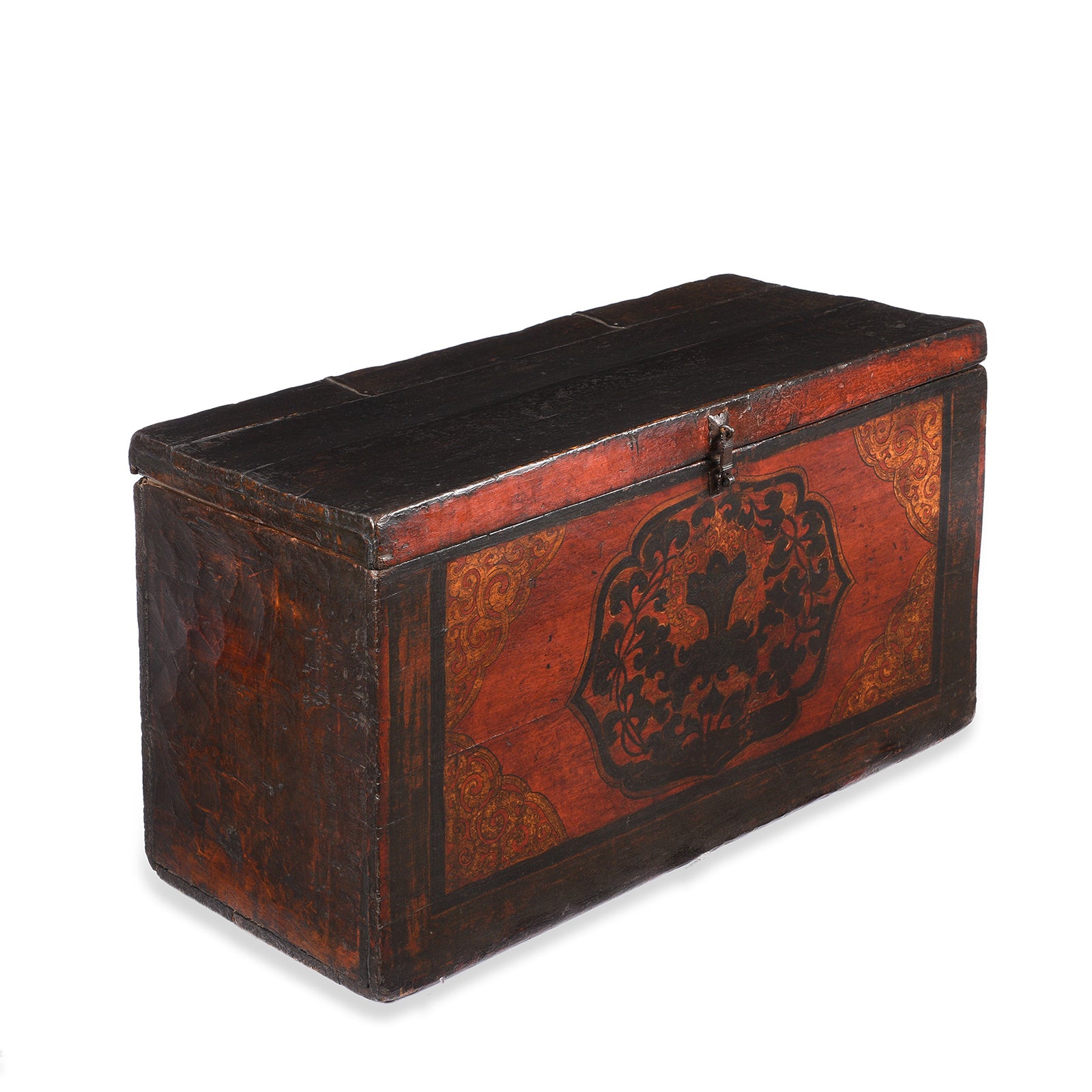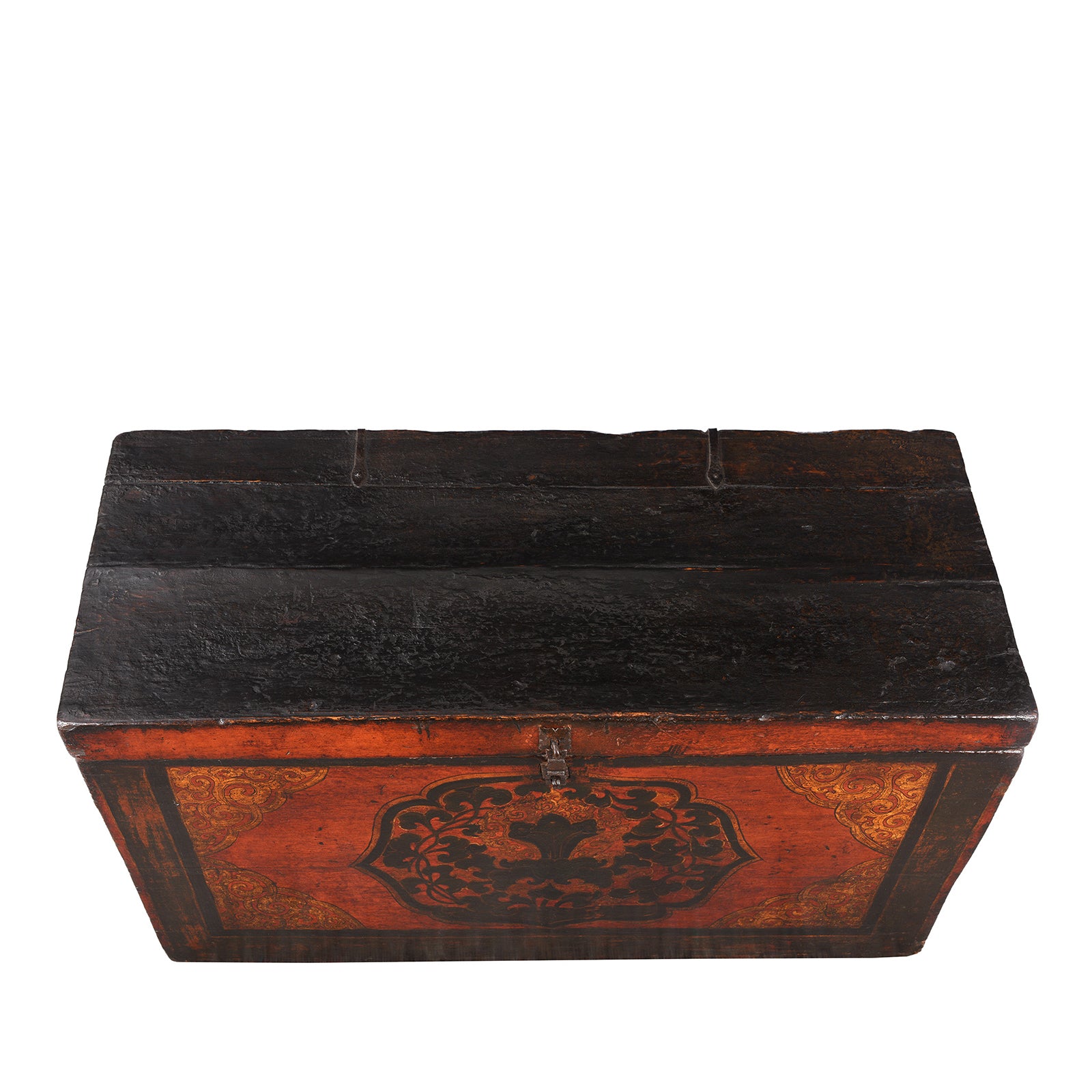Tibetan chests and trunks were used as storage in homes and monasteries. The better quality pieces are painted onto fabric on wood like this one. Often these chests were used in temples or as family altars for storing religious scrolls, silk ceremonial clothes, family jewelry, and yak butter used in lamps. Often people would gift painted furniture to temples as offerings.