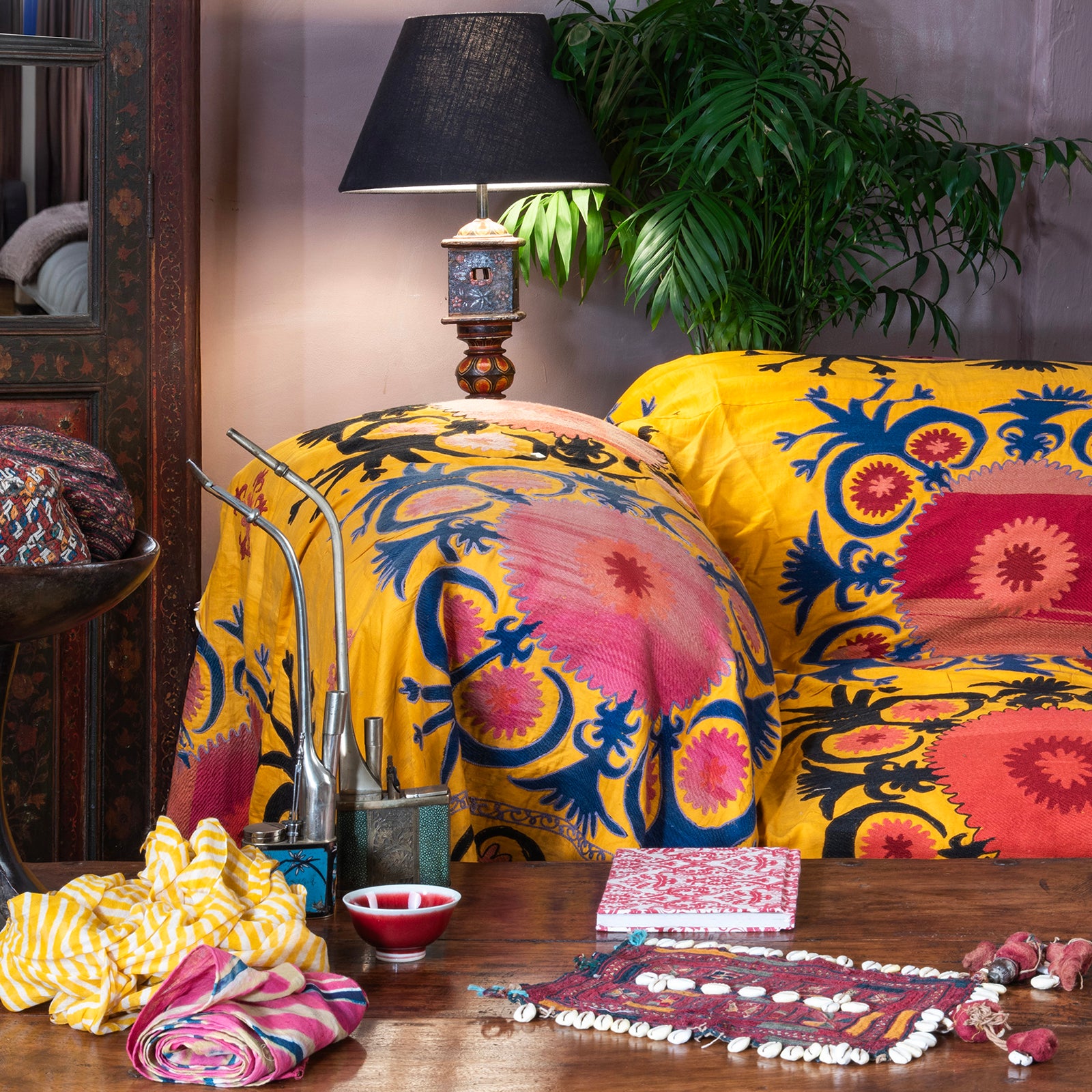 Each suzani is hand stitched on cotton and completely unique. Suzanis are traditionally the work of The Uzbek people. The word 'suzani' derives from the Farsi word for 'needle' and involves highly skilled wonderful silk embroidery, they make wonderful bed covers or a very dramatic wall covering or curtain.