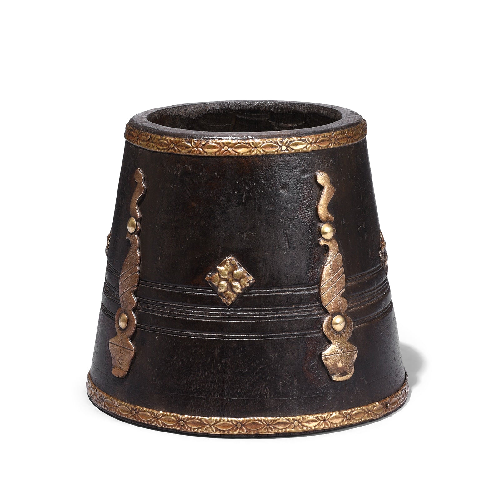 - Features: Traditional cylindrical grain measure, ornate brass decoration, rich aged patina