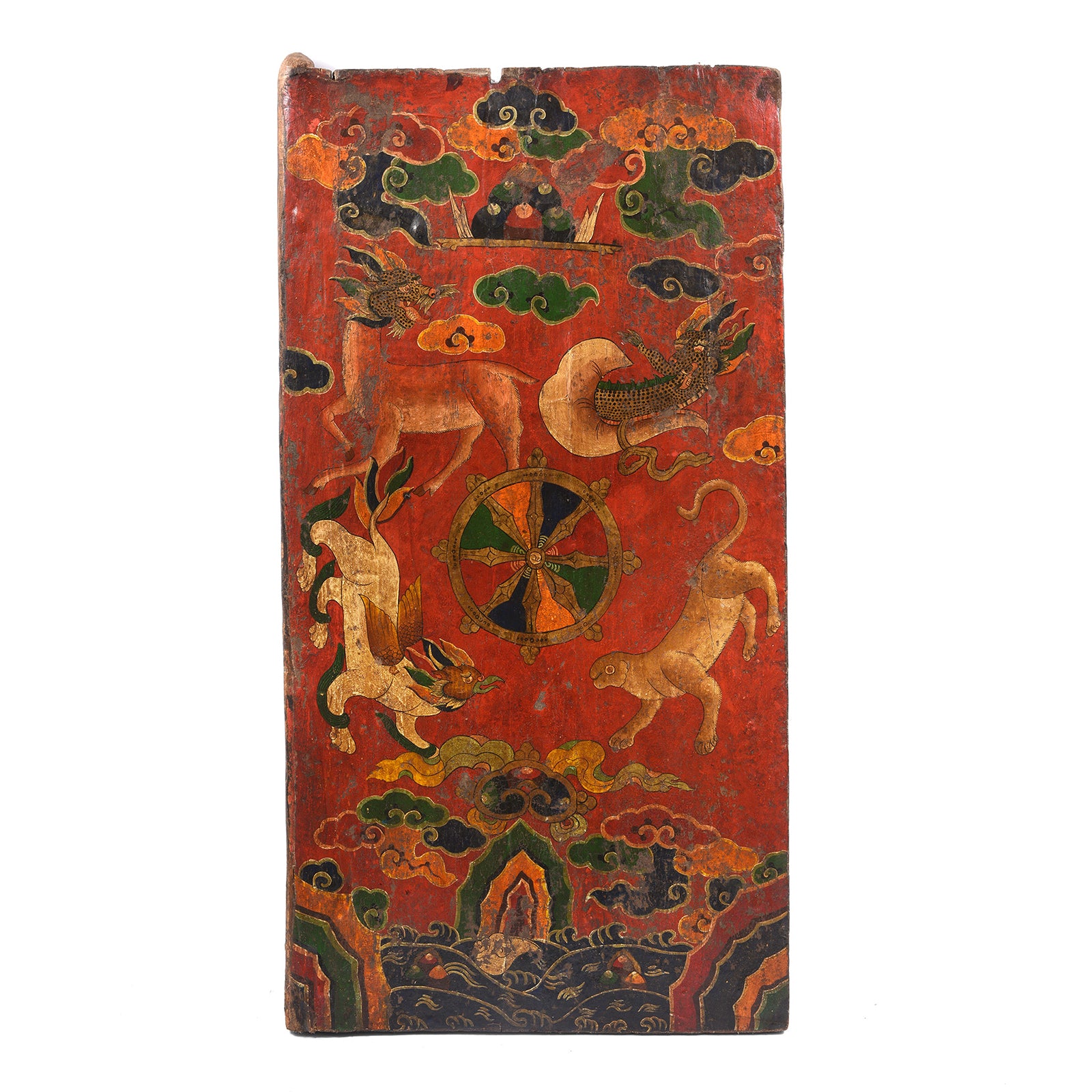 This vibrant antique Tibetan door is painted with the central motif of four auspicious animals circling the Wheel of Dharma, a symbol of Buddha & his teachings.