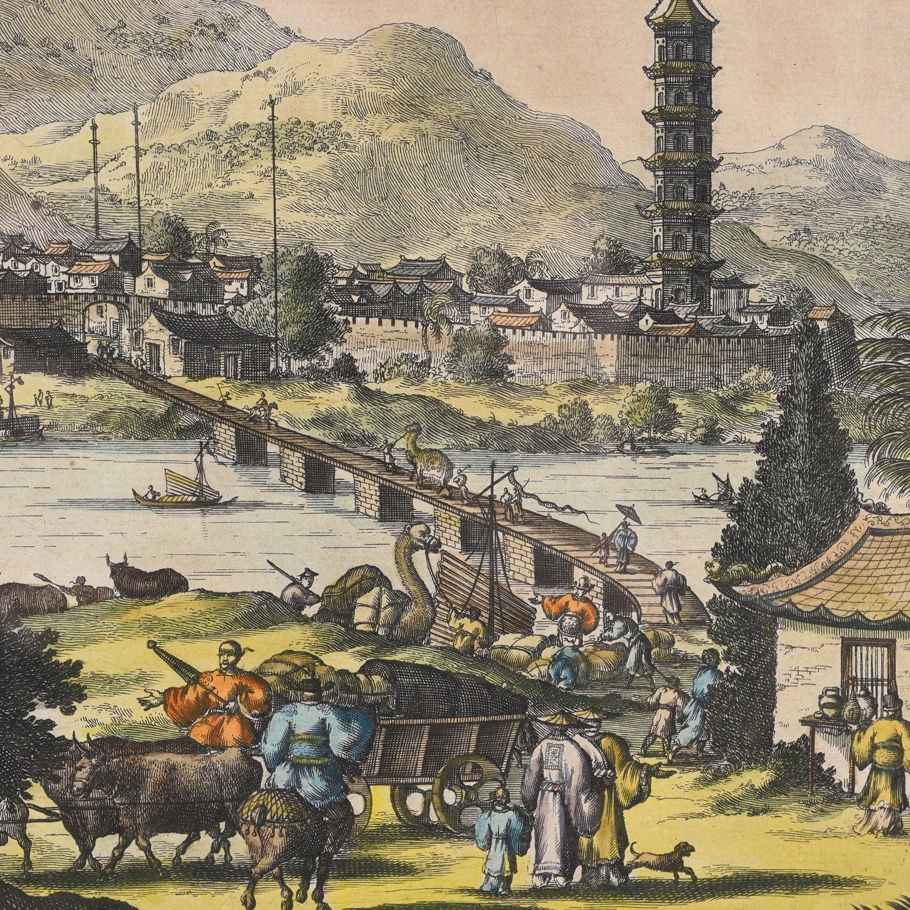 Detail From Original Tinted Engraving of Zhuzhou - 17thC | Indigo Antiques