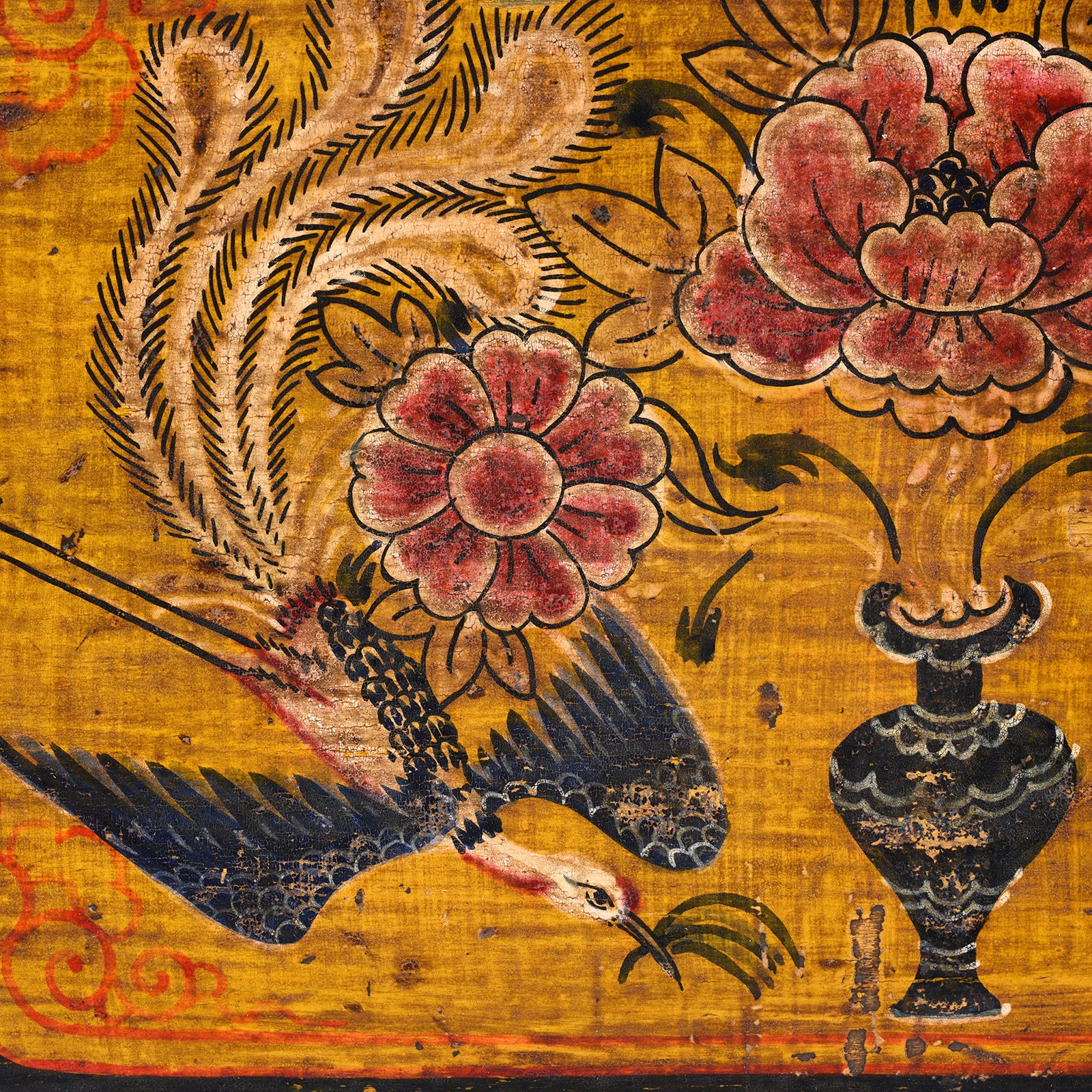 Side Paintwork From Antique Gansu Chest With Mongolian Painted Floral And Bird Motifs