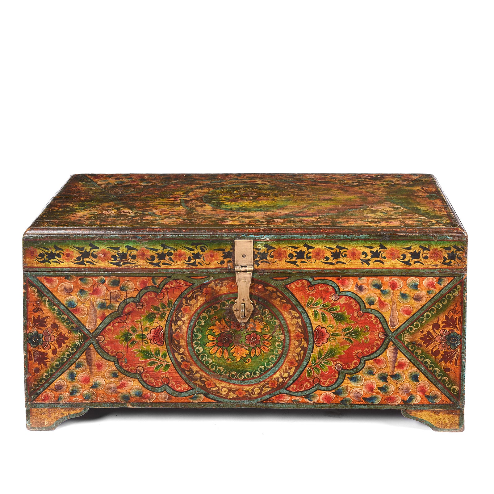This late 19th century Rajasthani chest has been upcycled and painted in traditional Rajasthani patterns some time over the past 40 years. Its vibrant style is a refreshing change from the sometimes austere military chests of the 19th century and the vibrant colours and patterns reflect a rich Indian tradition of painting furniture and household objects.