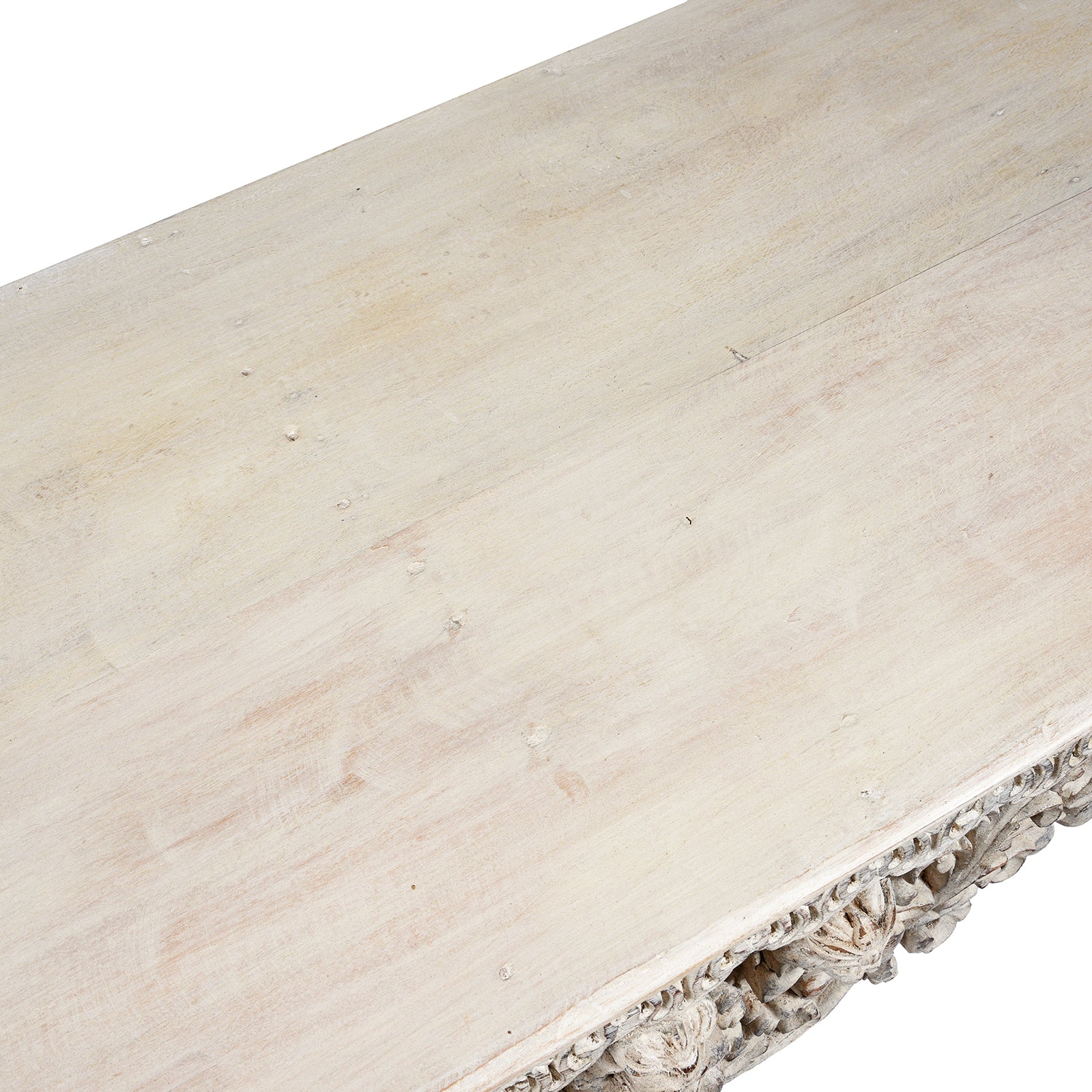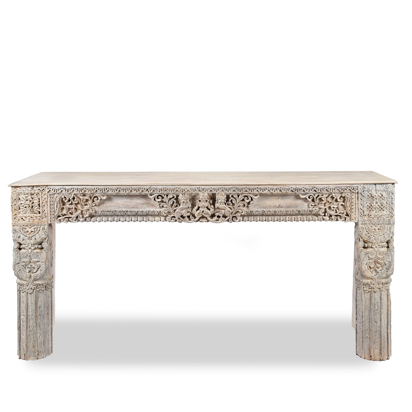 This carved Indian console table has been lovingly constructed from reclaimed teak from old Indian buildings that have fallen into a state of disrepair. With each carving completely unique, this console table is truly one of a kind. The central carved panel depicts a Hindu god flanked by lions, most likely Narasimha, an avatar of Vishnu. Trailing leaves decorate the panel. Each piece of wood dates to the 19th century, giving this piece history while being newly sustainable.