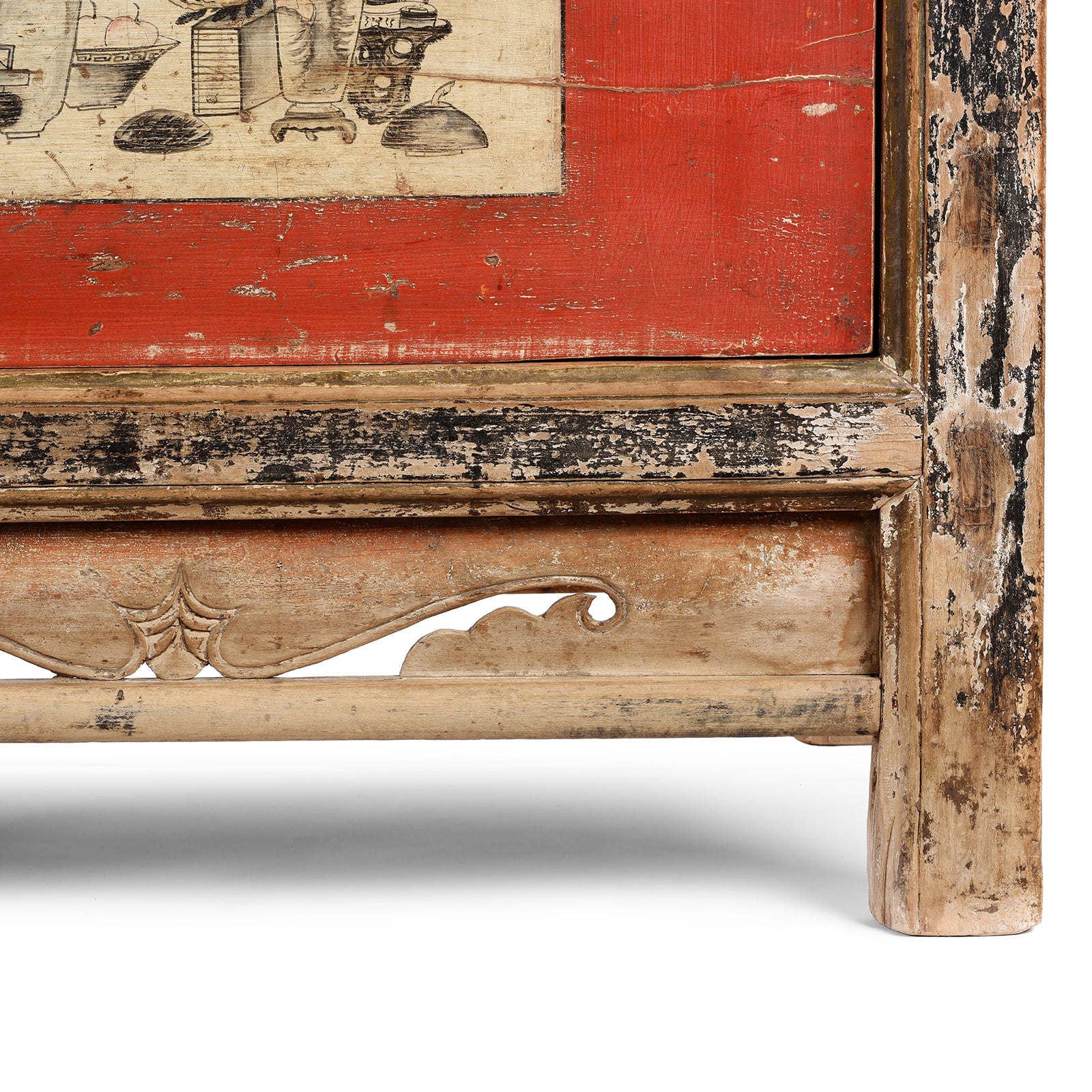 Its doors are decorated with a landscape scene on the left and a collection of lucky objects on the right. What's lovely about this piece is its relative originality as the painting and carving is all original. The doors are decorated with household objects and objects inspiring wisdom.