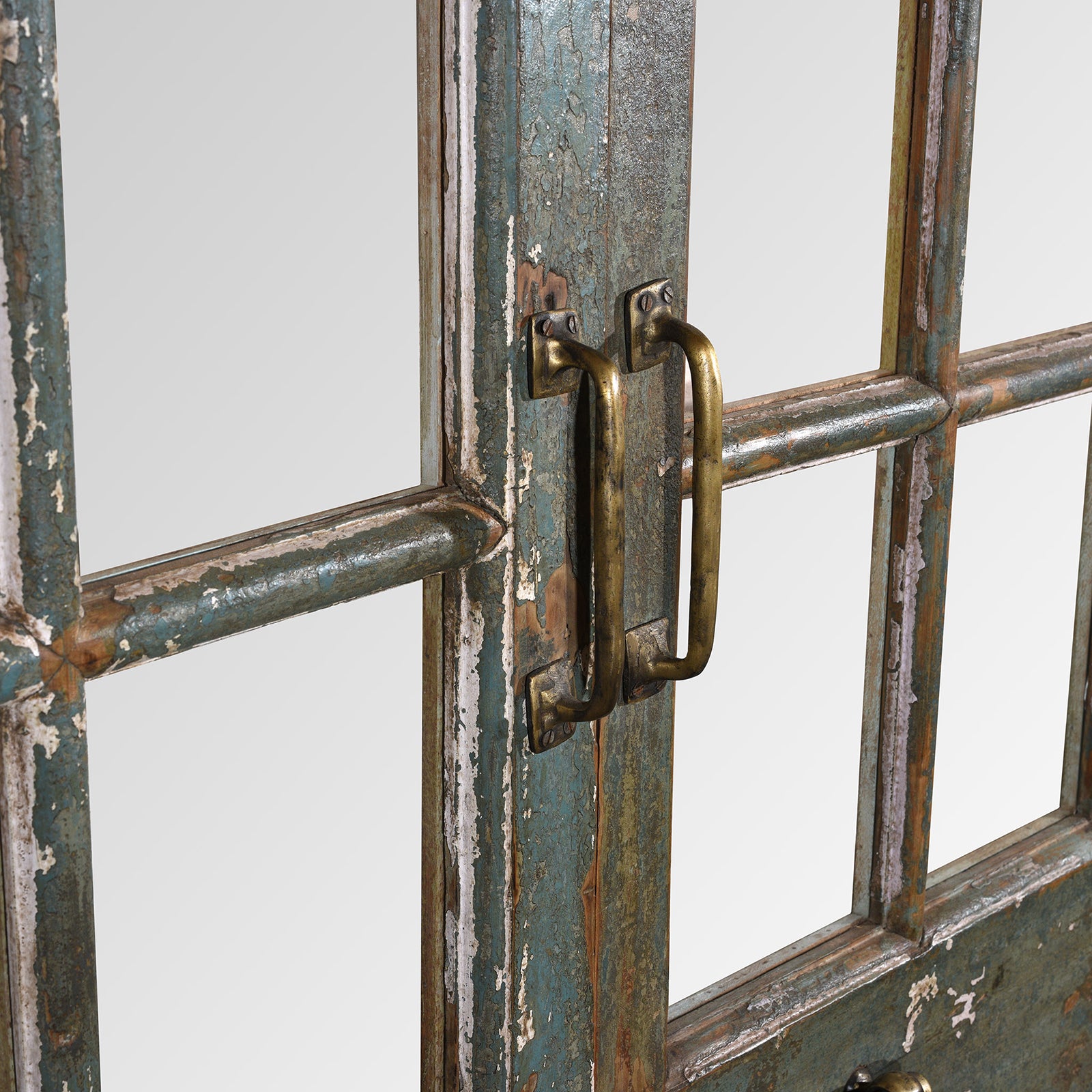This lovely Indian green-blue door with glass panels has the original distressed paint and would be perfect for a room that benefits from lots of light. These doors can be built in as doors or used as room dividers.