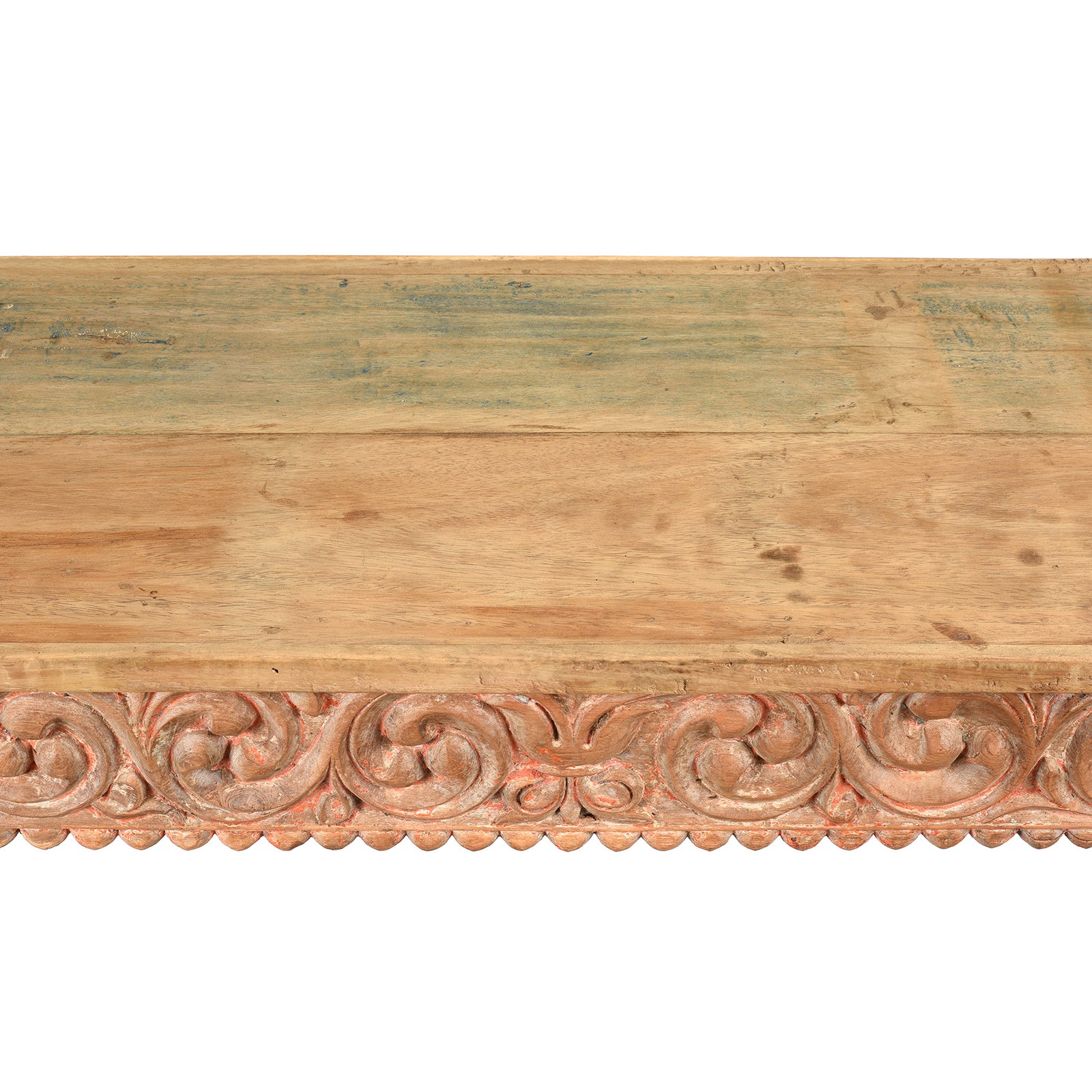With each carving completely unique, this console table is truly one of a kind. Each piece of wood dates back to the 19th century. Traces of old paint and ritual tika powder can be seen embedded within the carvings which add to its beautiful character.