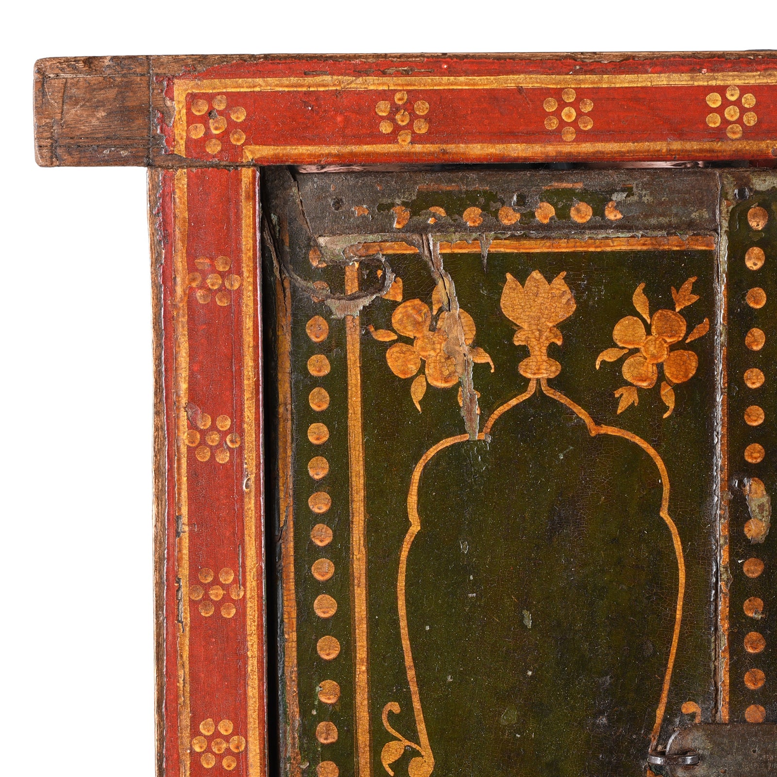 This style of painting on decorative shutters can only be found in Bikaner and the surrounding areavin Rajasthan. It is a city that is famous for its fine painting of boxes and the interiors of buildings. This shutter would have been plastered into the wall with a cavity for storing keepsakes.