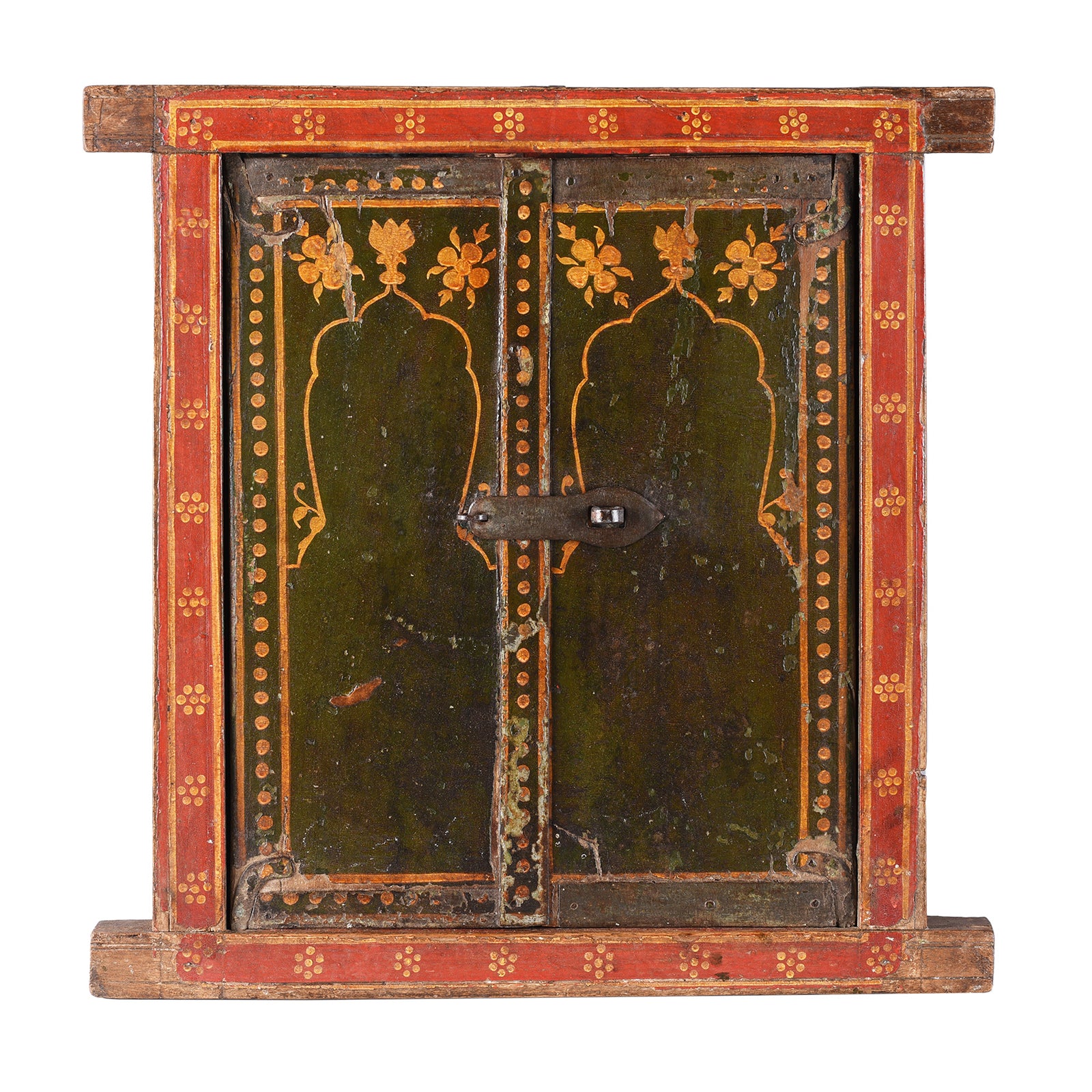 These beautifully painted antique Indian shutters from Bikaner in Rajasthan have been modified to house a mirror.