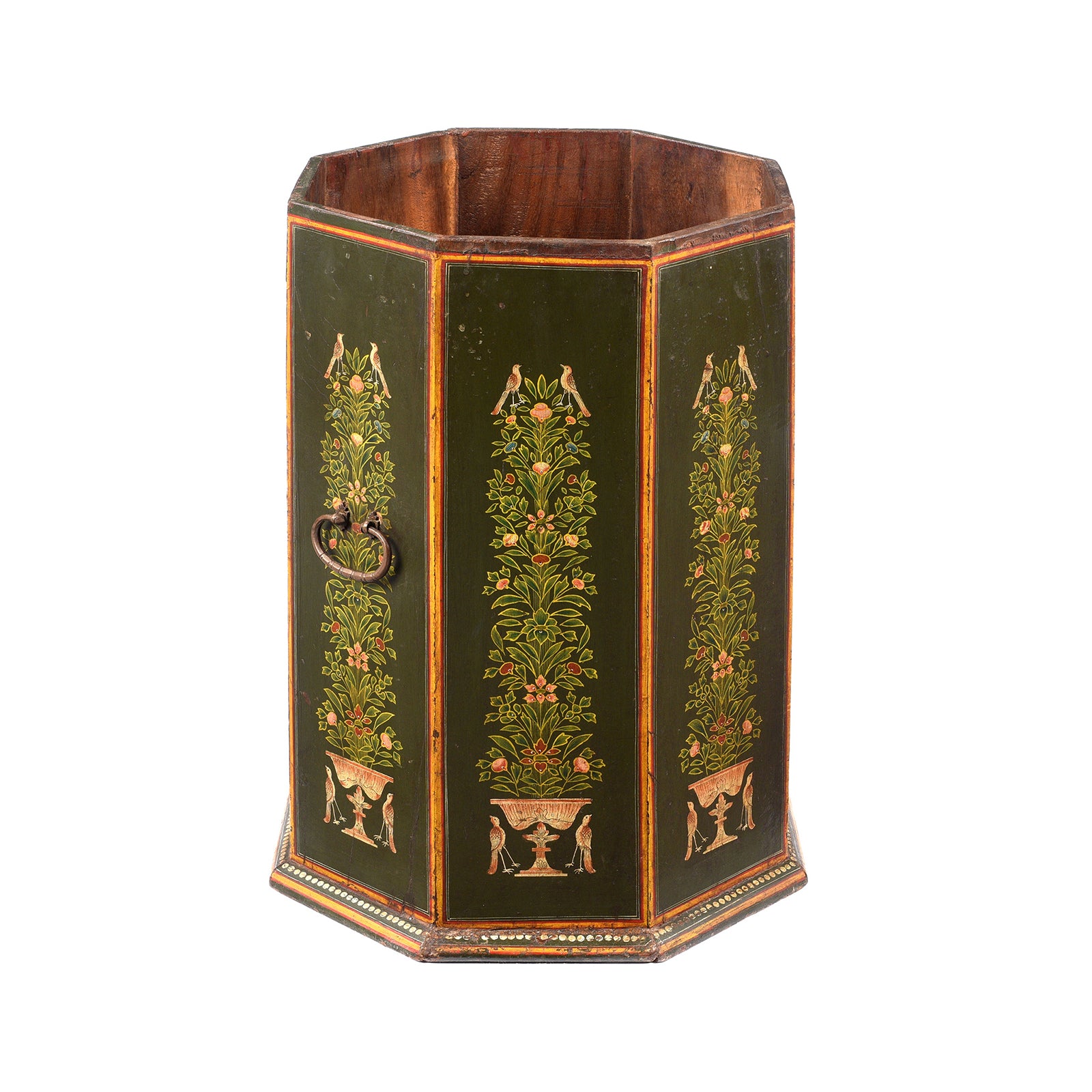 This painted Indian umbrella & stick stand was made in India in the last 15 years. It features birds perched atop the Tree of Life on a dark green background, a theme often found on old doors in Bikaner, Northern Rajasthan.