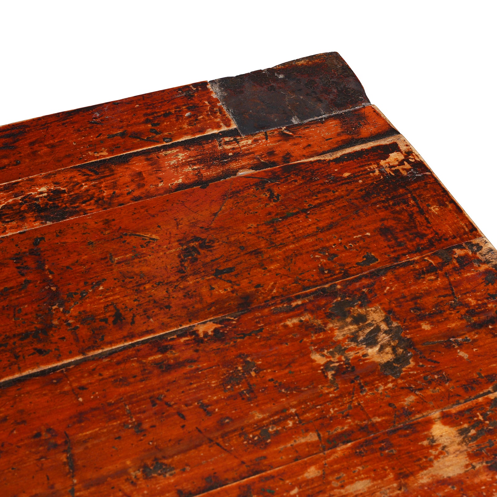 One figure within the central panel has had his facial features deliberately scratched out. This is a purposeful act rather than accidental damage and is occasionally encountered on Qing-period painted furniture. The defacement is widely understood as a form of later iconoclasm, potentially reflecting changing social, religious, or political attitudes towards representational imagery. It may also relate to the cabinet’s later reuse or adaptation within the household, where symbolic imagery was consciously altered to neutralise its original meaning. The rest of the painted surface remains intact, reinforcing the view that this intervention was intentional and selective.