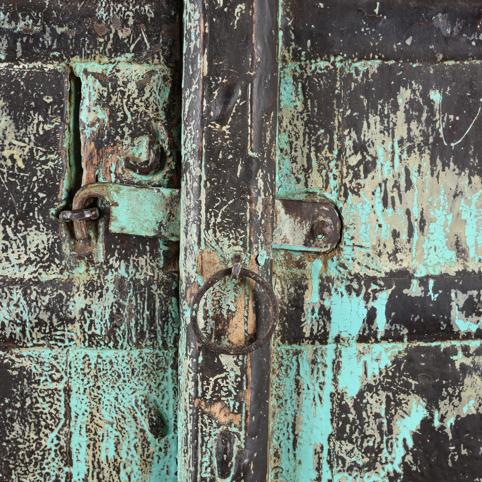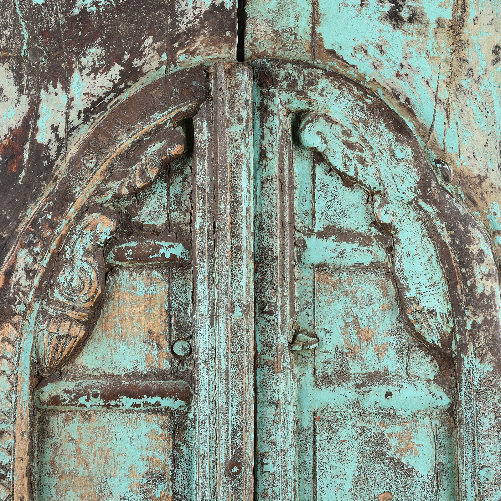 These carved teak window shutters are carved with the instantly recognisable 'Mughal Arch'. In their long life, they have been subjected to the hot Rajasthani air and have had various paint jobs. This has given them a pleasing 'distressed' look that would fit in with a multitude of interior styles.