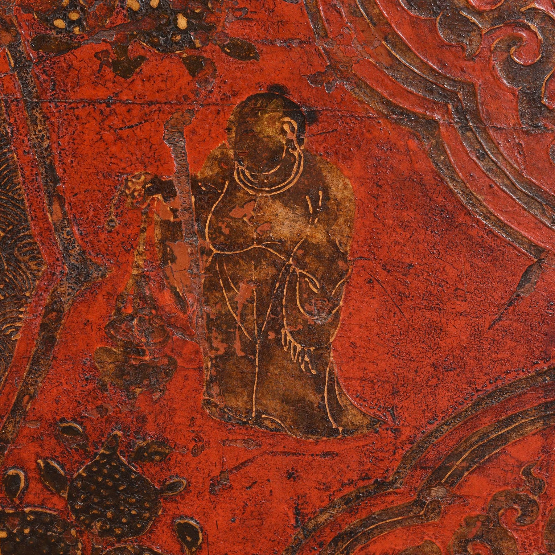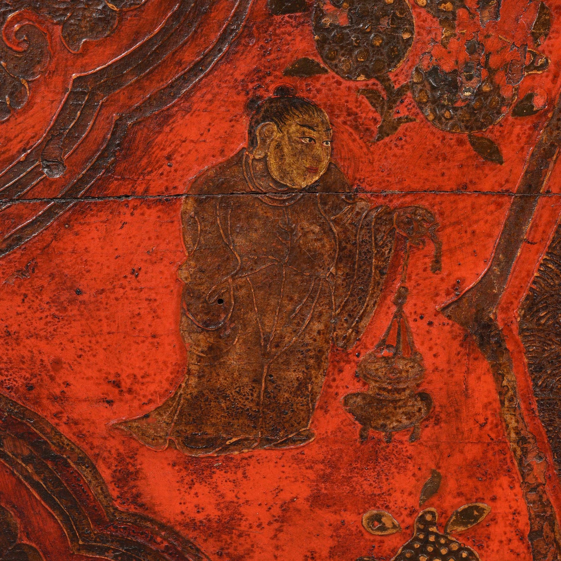 Painted and incised to the front with a pair of confronting dragons holding an offering bowl of precious jewels, all within a quatrefoil medallion, surrounded by attendant figures, mythical beasts and peaches, all framed by foliate spandrels and a scrolling floral border