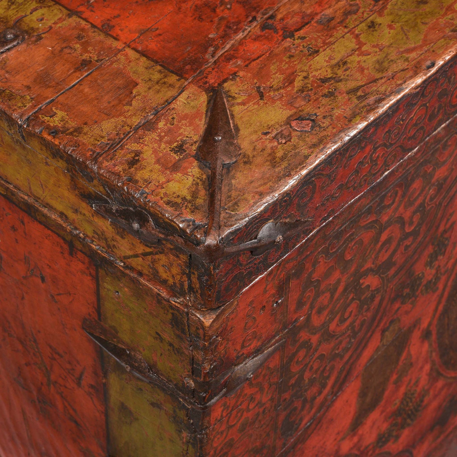 Tibetan chests and trunks were used as storage in homes and monasteries. Boxes are normally made from cedar, pine or poplar. If they are painted it is usually just the front and 2 sides. They can either be painted directly on the wood or on older pieces onto a fabric applied to the wood. The colours and designs used are very decorative.