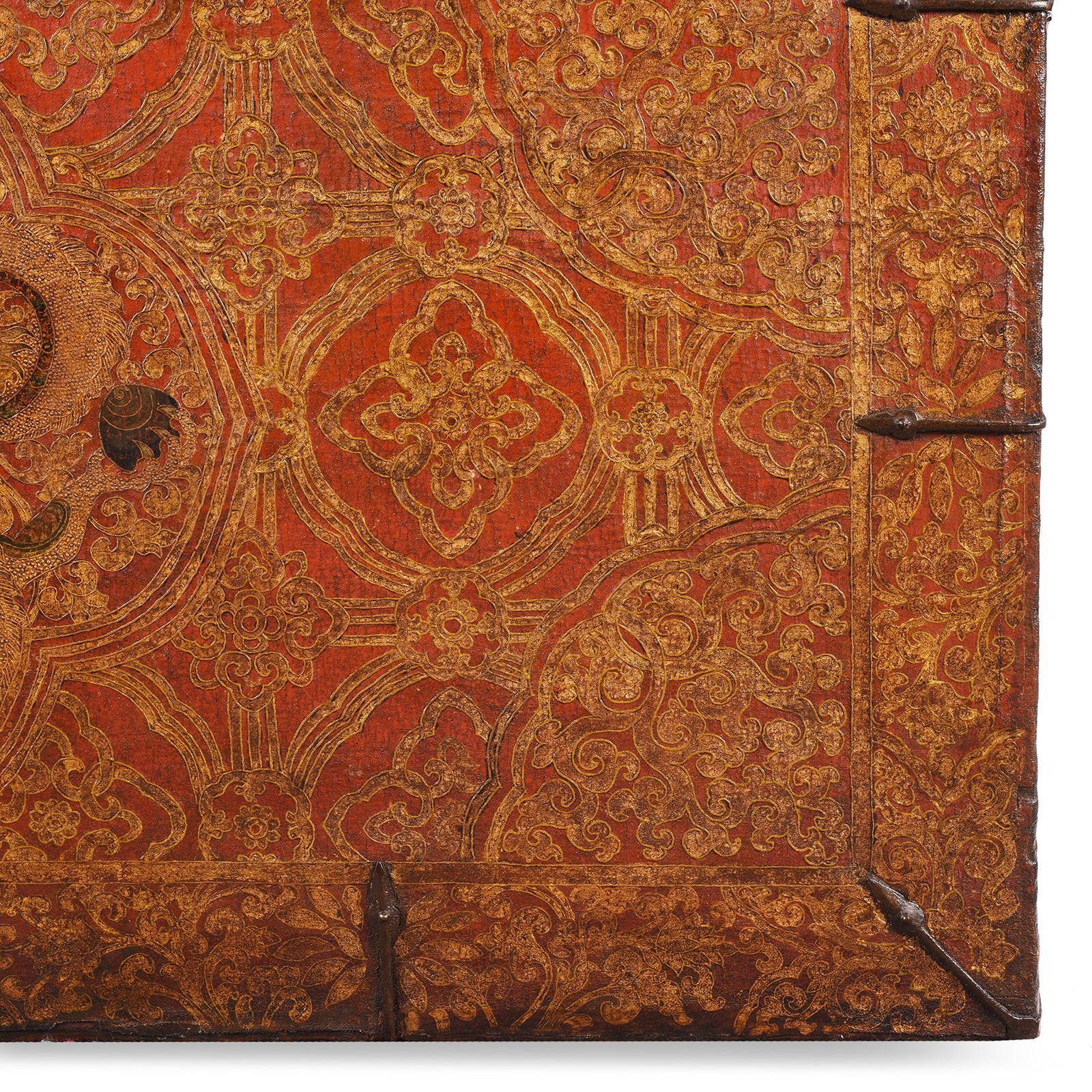 The crimson foreground is decorated in vibrant polychrome pigments with a central panel enclosing a ferocious writhing dragon grasping two jewels. The jewels represent knowledge passed down by the Buddha while the interlocking-Y textile design likely derives from body armour from the Central Asian regions and can be seen in the armour worn by the Four Guardian Kings, who are depicted in the entranceways of many Tibetan temples."
