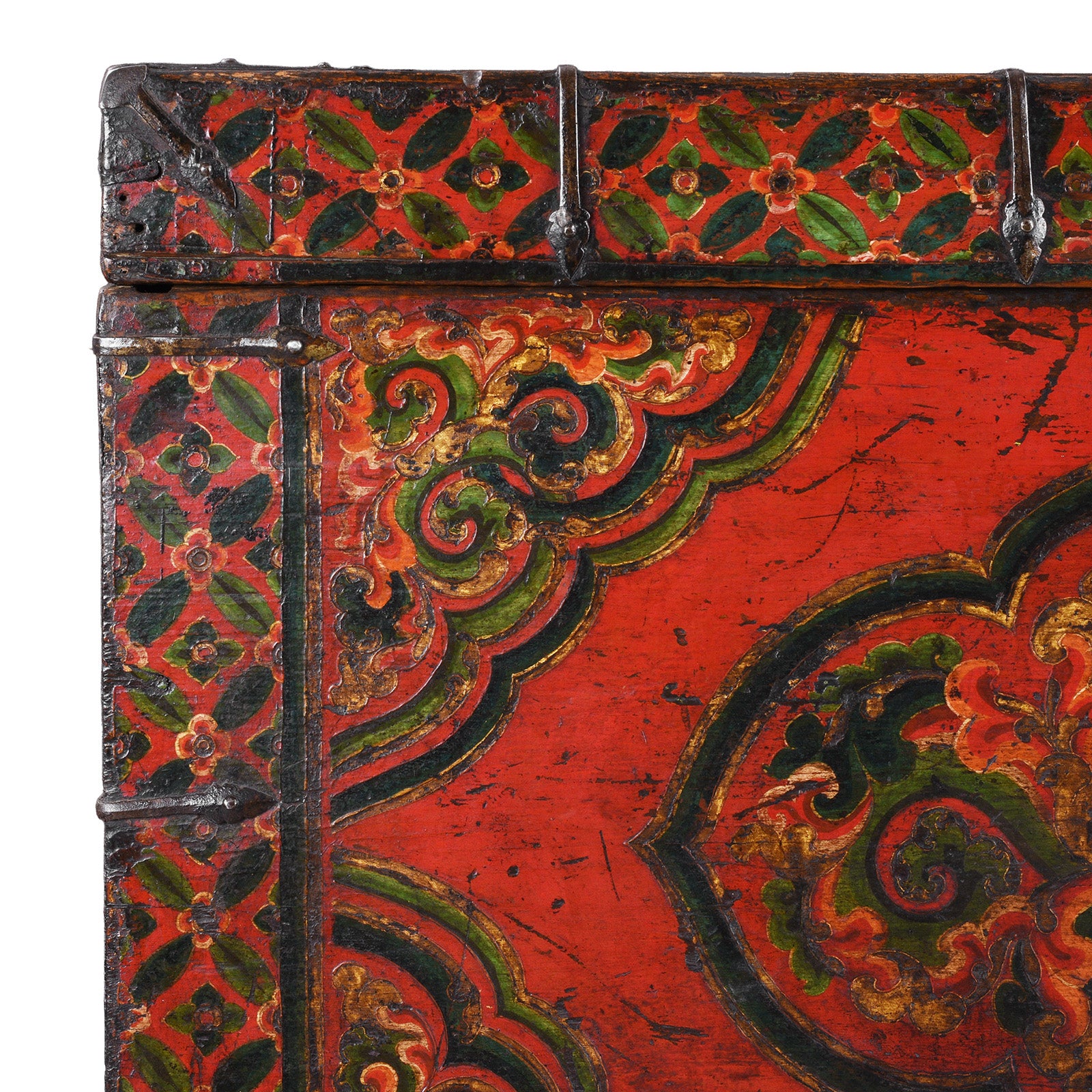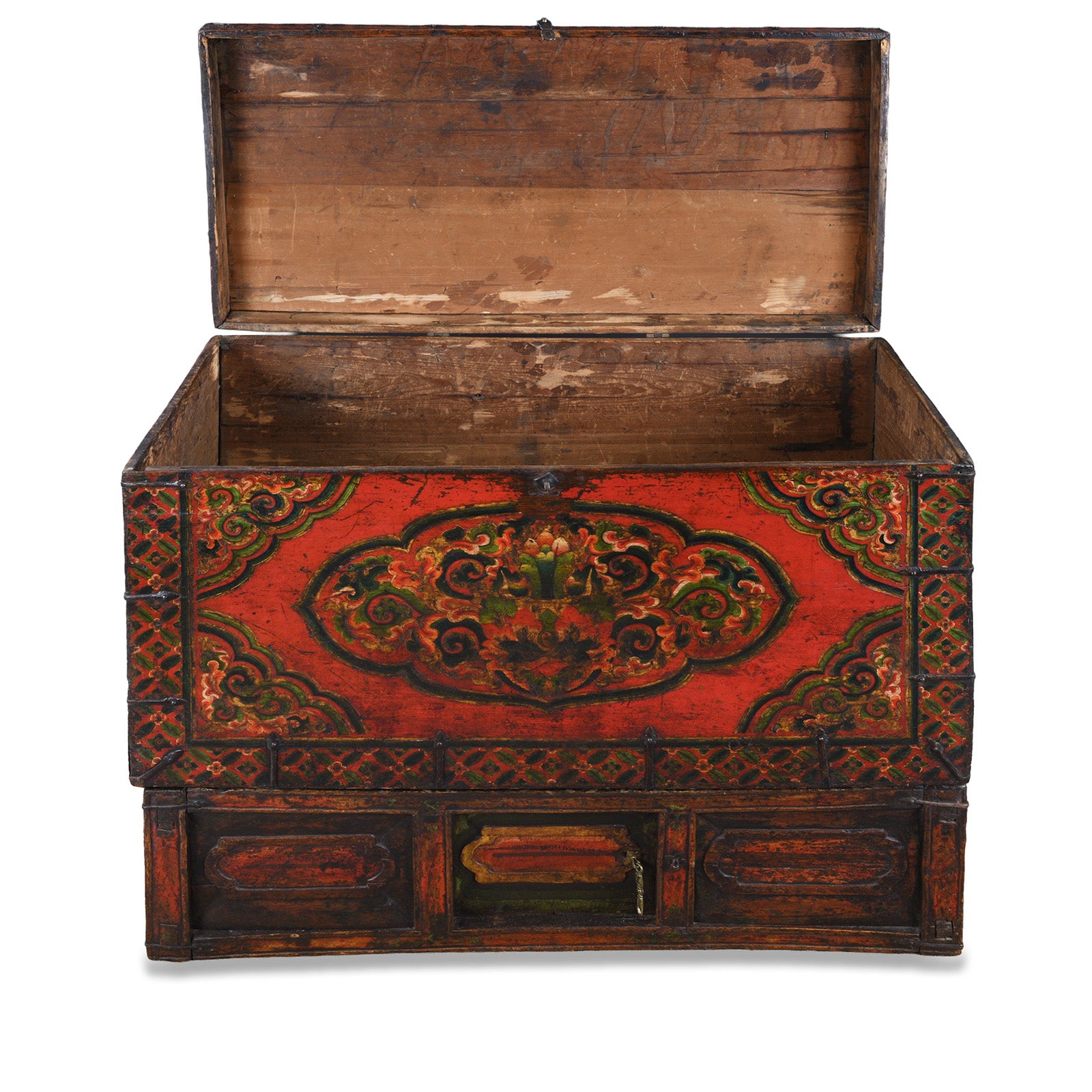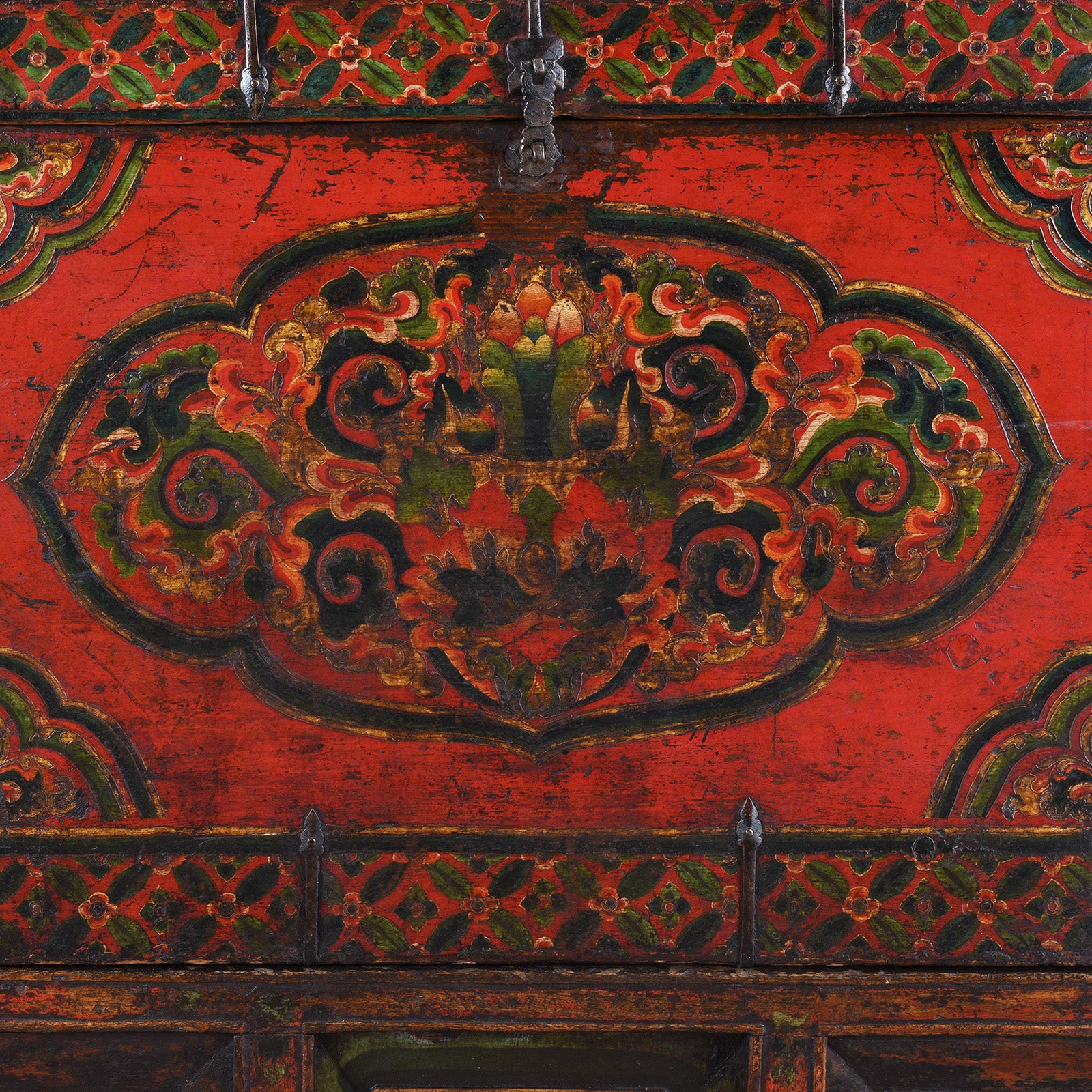Original Tibetan chests of this quality are now extremely scarce, and examples retaining their original stands are almost unheard of. Comparable painted monastic chests are held in museum collections including the Rubin Museum of Art and the British Museum, underscoring the cultural and religious significance of this form.