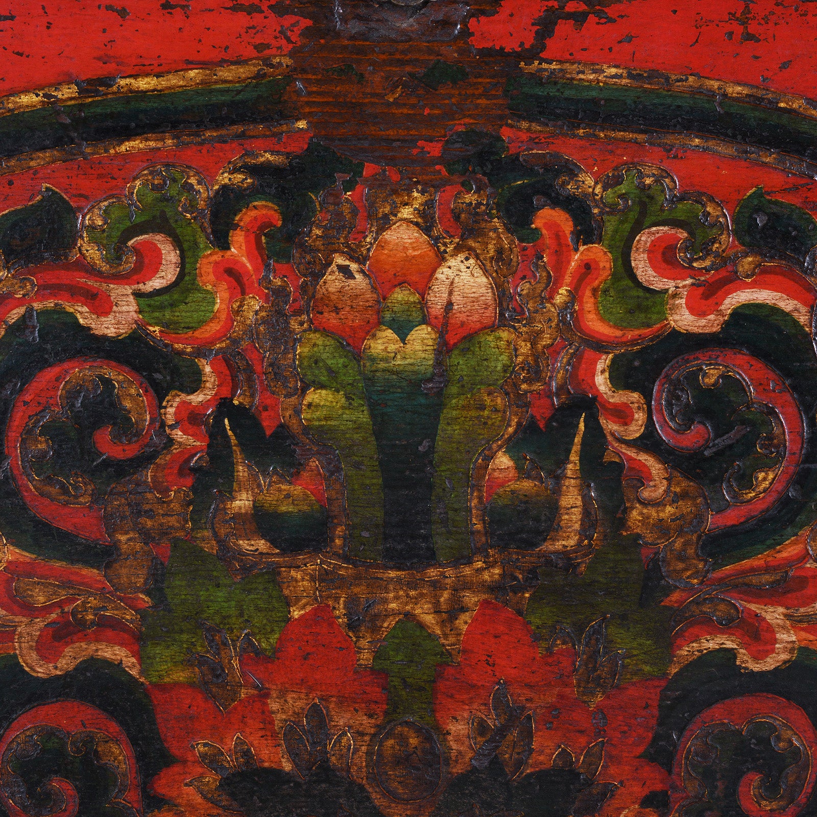 The symbolic programme continues across the chest, with a painted roundel to the side panel depicting the Wheel of Dharma incorporating the Three Jewels, reinforcing the chest’s monastic and ritual function. Such chests were traditionally used within monasteries and domestic shrines to store sacred texts, ceremonial textiles, jewellery, and ritual items, and were often donated as devotional offerings. The lotus, emerging unstained from dark waters, represents purity and liberation, while the Three Jewels symbolise Buddha, Dharma, and Sangha, believed to fulfil the altruistic aspirations of their owner.