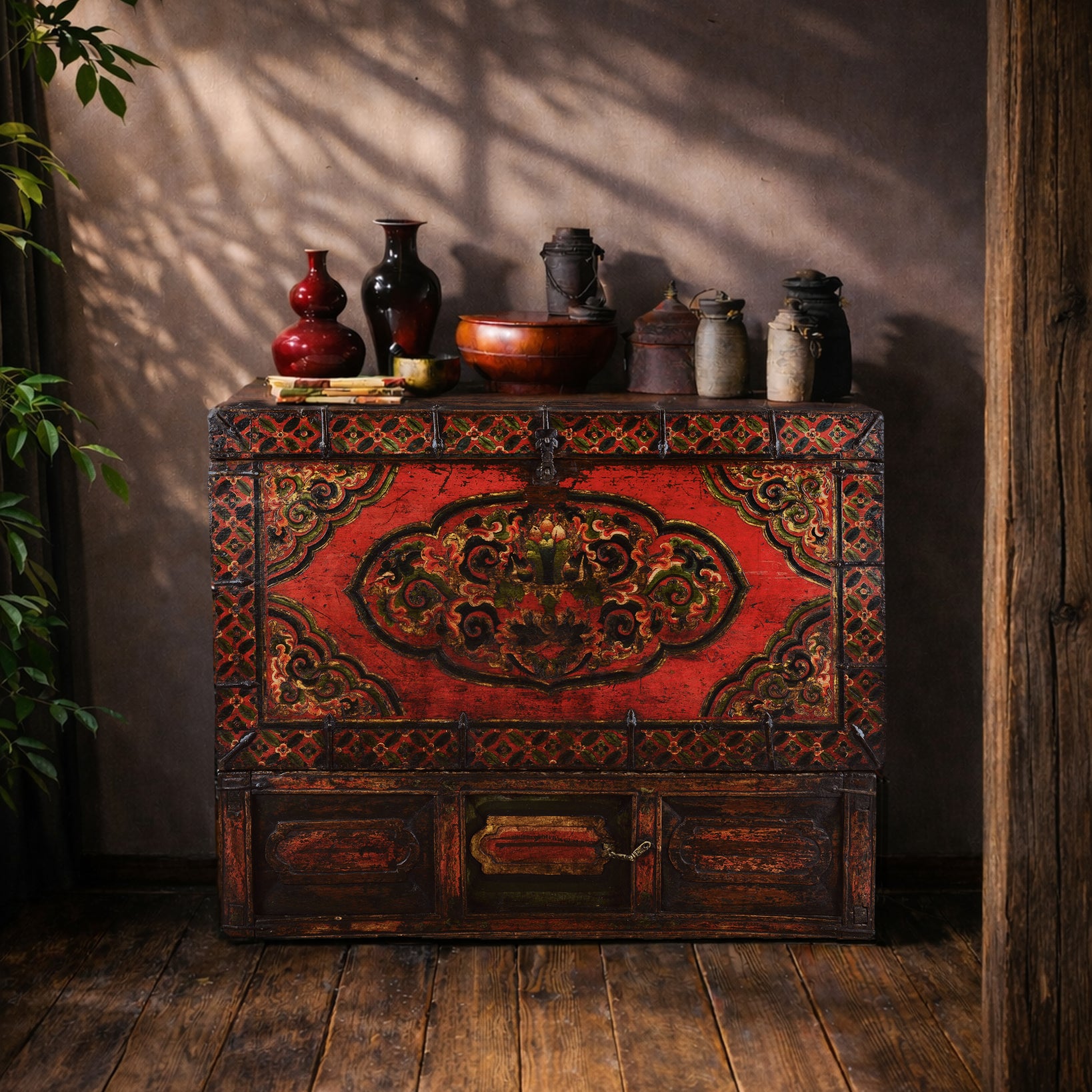 Richly painted and exceptionally complete, this rare 18th-century Central Tibetan monastic chest is a powerful survival of Himalayan religious furniture. The front panel is dominated by the Three Jewels (dkon-mchog gsum), depicted as flaming wish-granting gems (cintāmaṇi) rising from a blossoming lotus, framed by flowing floral scrolls and geometric borders. Executed in deep mineral reds, greens, and ochres, the imagery reflects the visual language of Tibetan Buddhism, combining devotional symbolism with confident, highly accomplished painting.