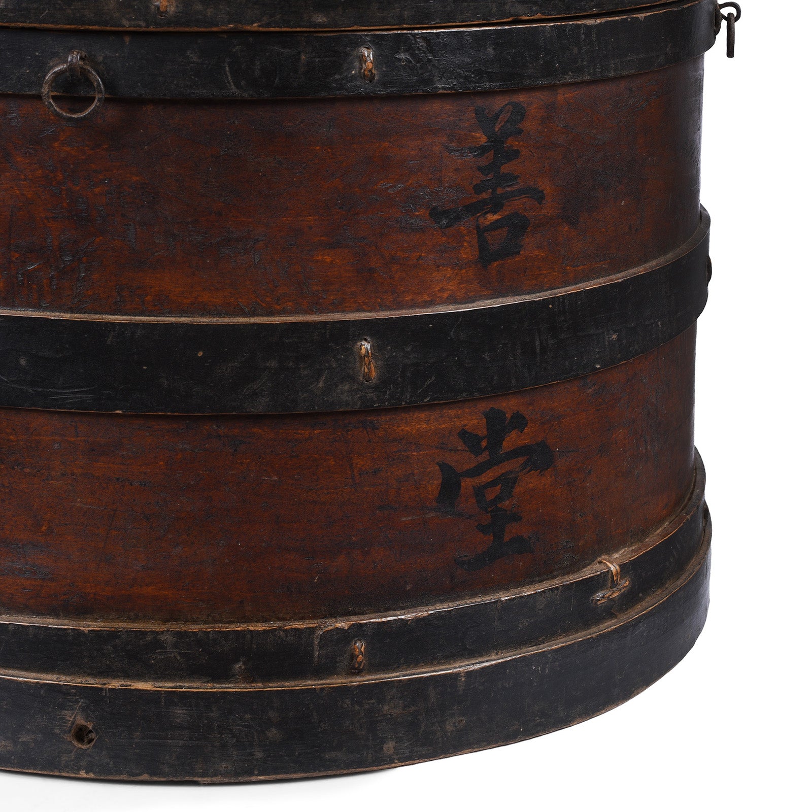 Constructed from woven willow wood and reinforced with darkened wooden bands, the box is both lightweight and remarkably durable. The exterior displays hand-painted Chinese characters, once used as practical identifiers to denote ownership or contents, and now adding a striking graphic quality to the surface. Iron rings and fastenings further enhance its utilitarian character, while the rich patina speaks to decades of use.
