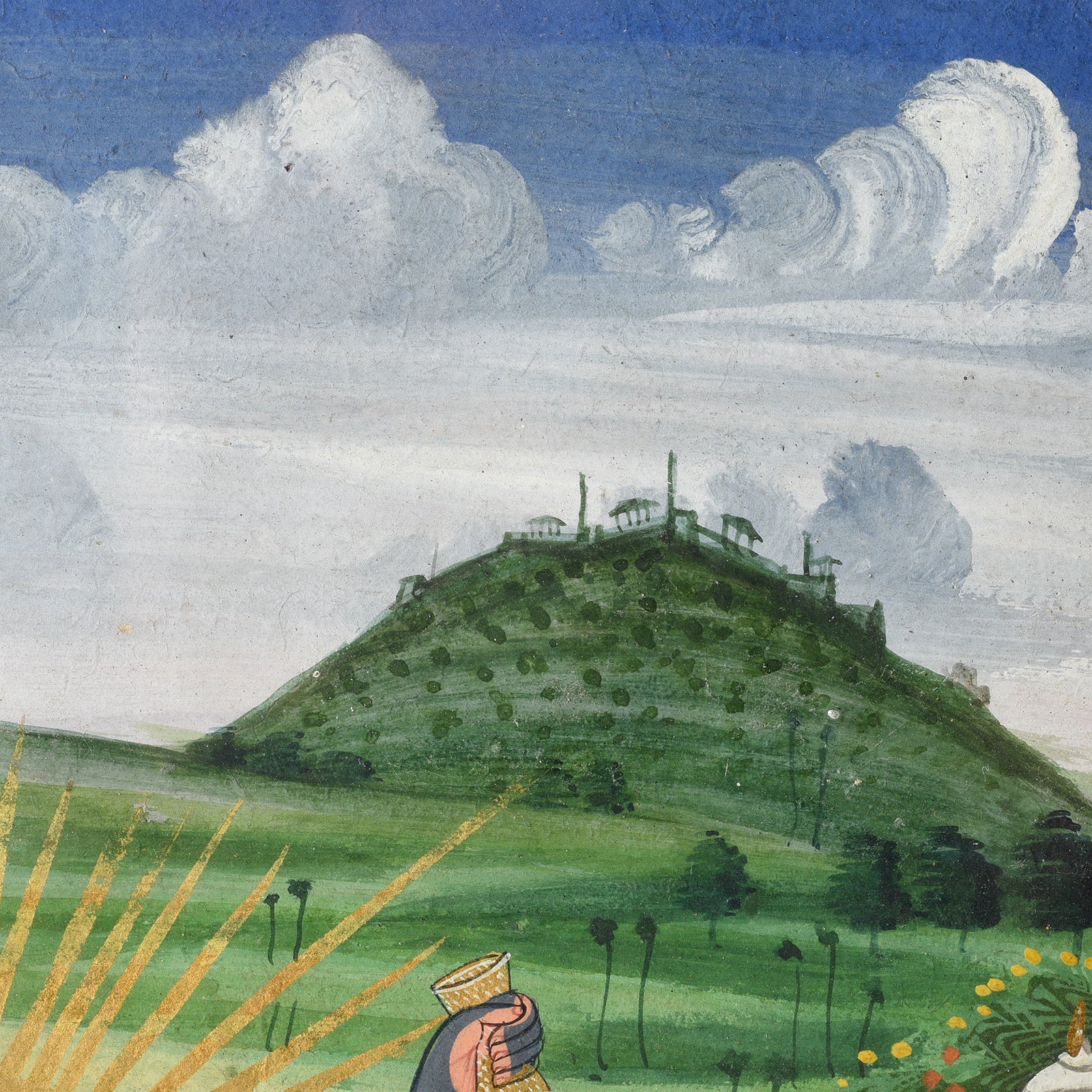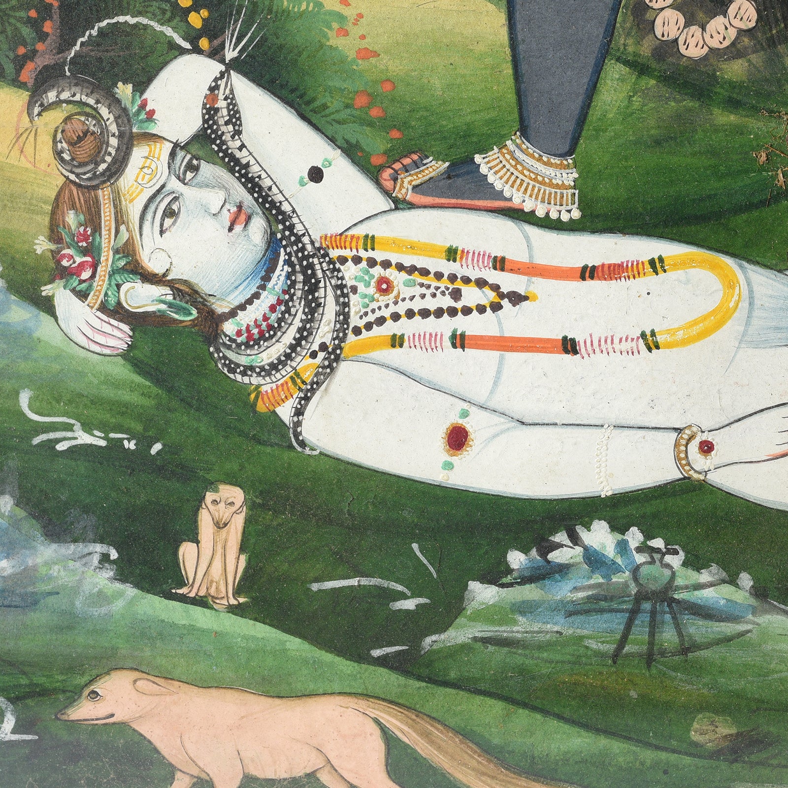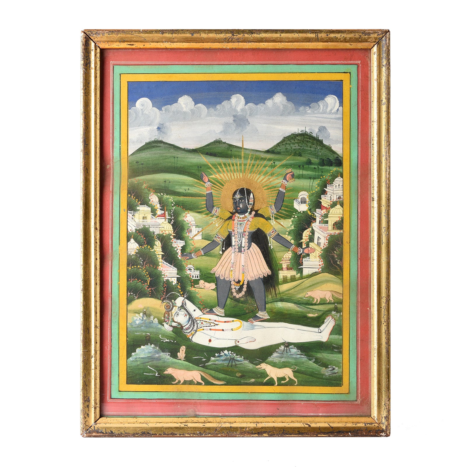 This Indian 19th century Jaipur school gouache painting depicts Kali trampling a prostrate Shiva. The Hindu goddess Kali became enraged that many demons and asuras had begun dominating the world. In a fury, Kali went into a bloodlust and slaughtered everything. Her husband and lord of the gods, Shiva went to stop her rage, but nothing would could stop her. In desperation, he threw himself beneath her feet. As she began to trample him, her trance was broken, saving the universe from total destruction.