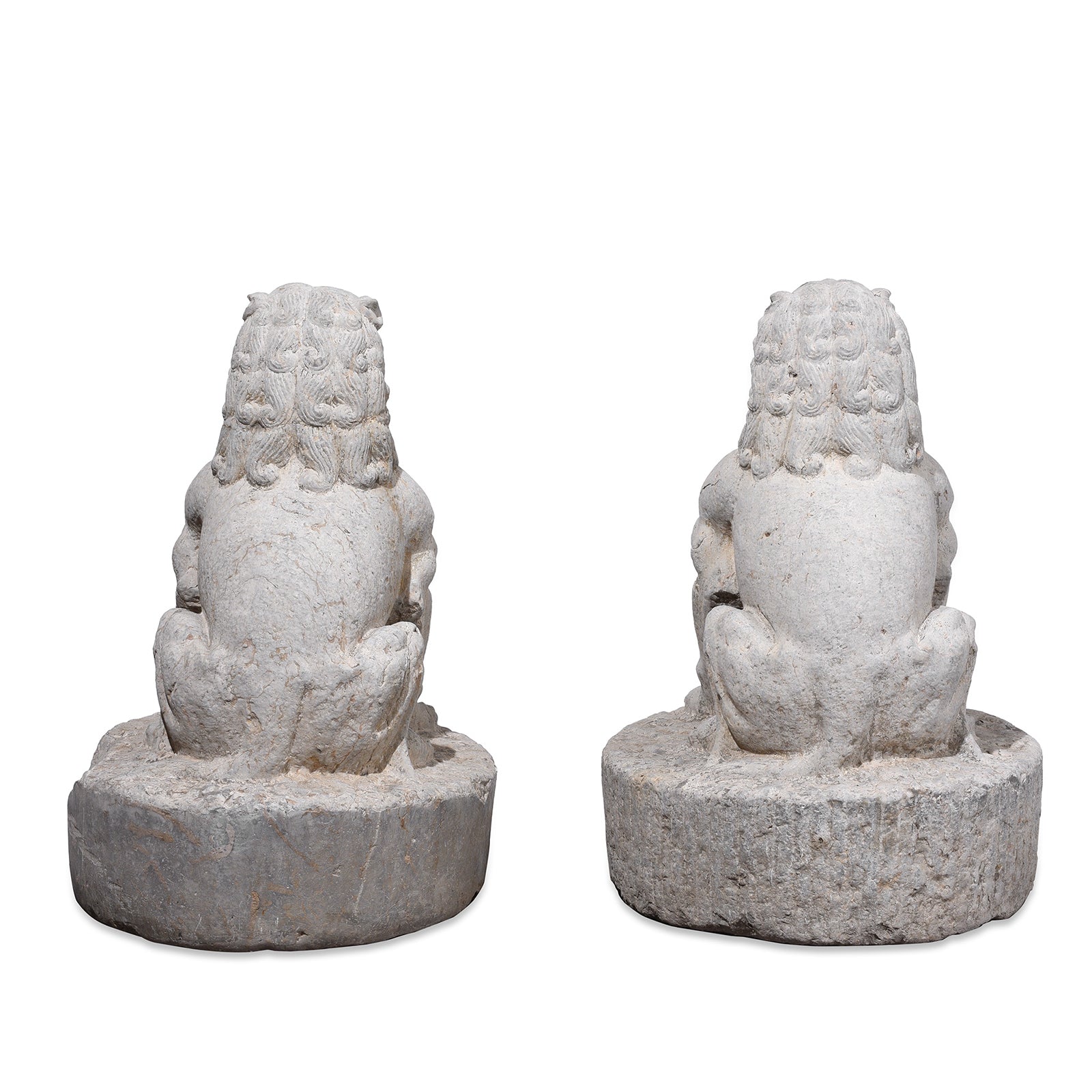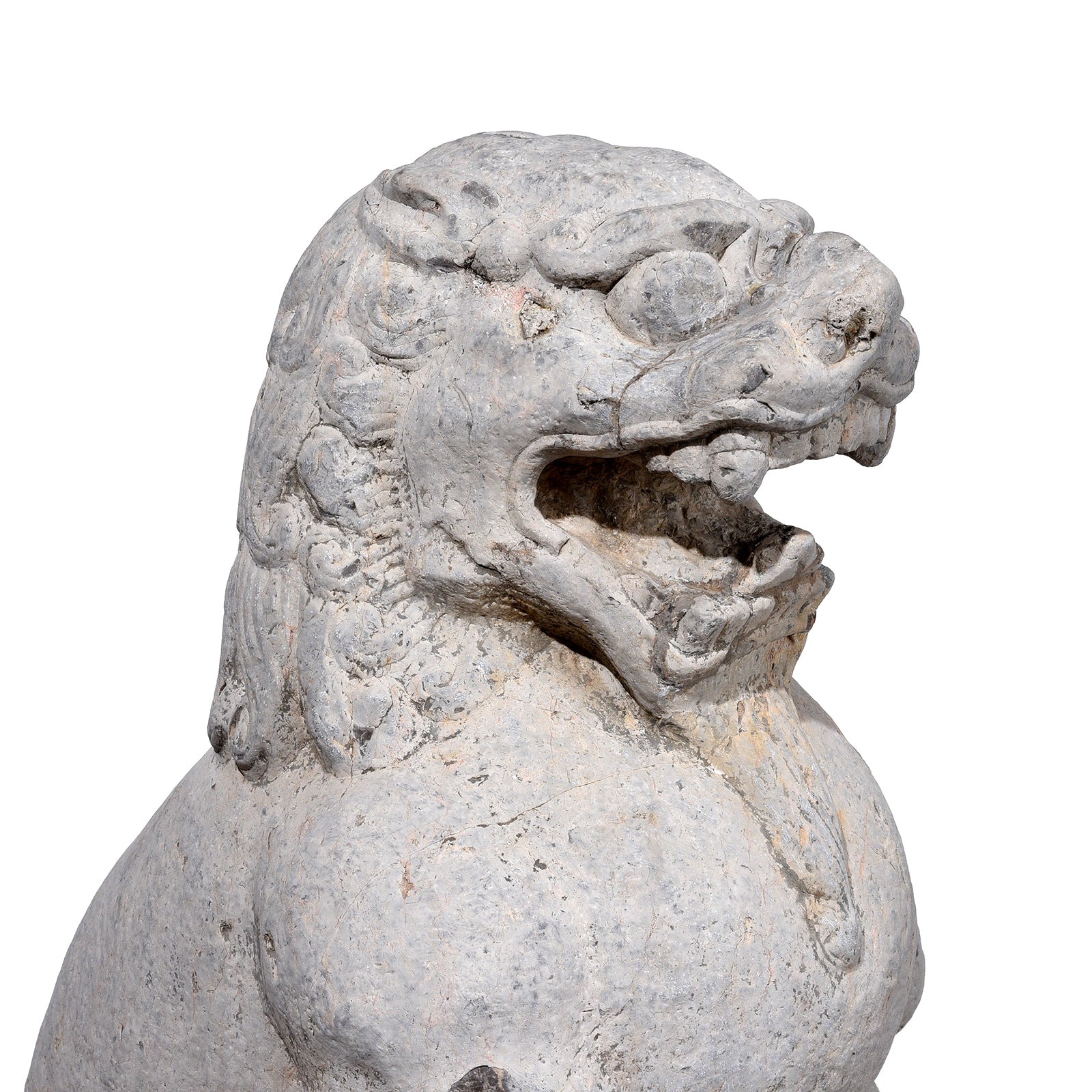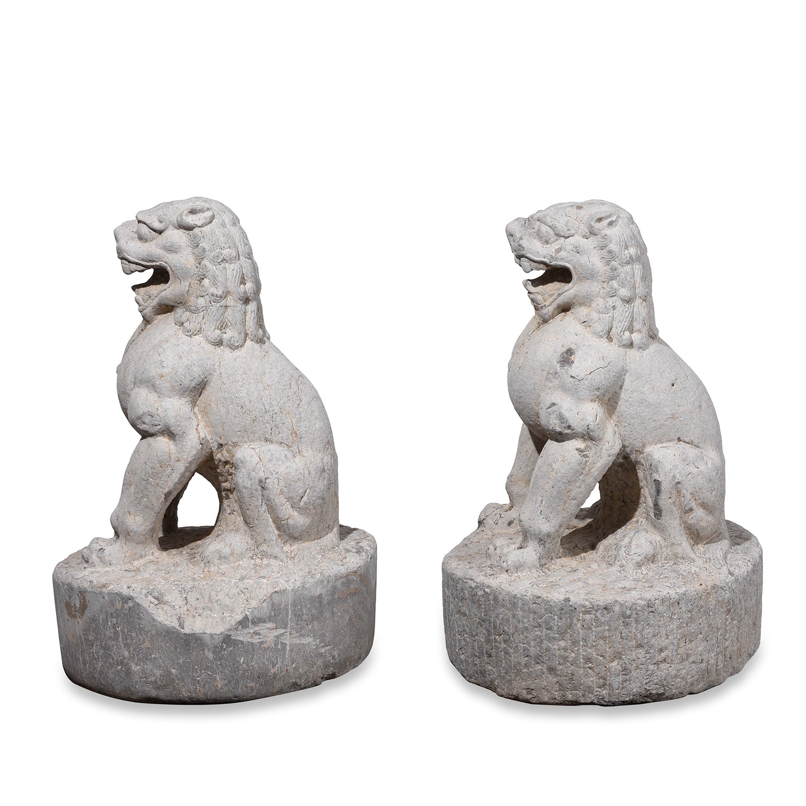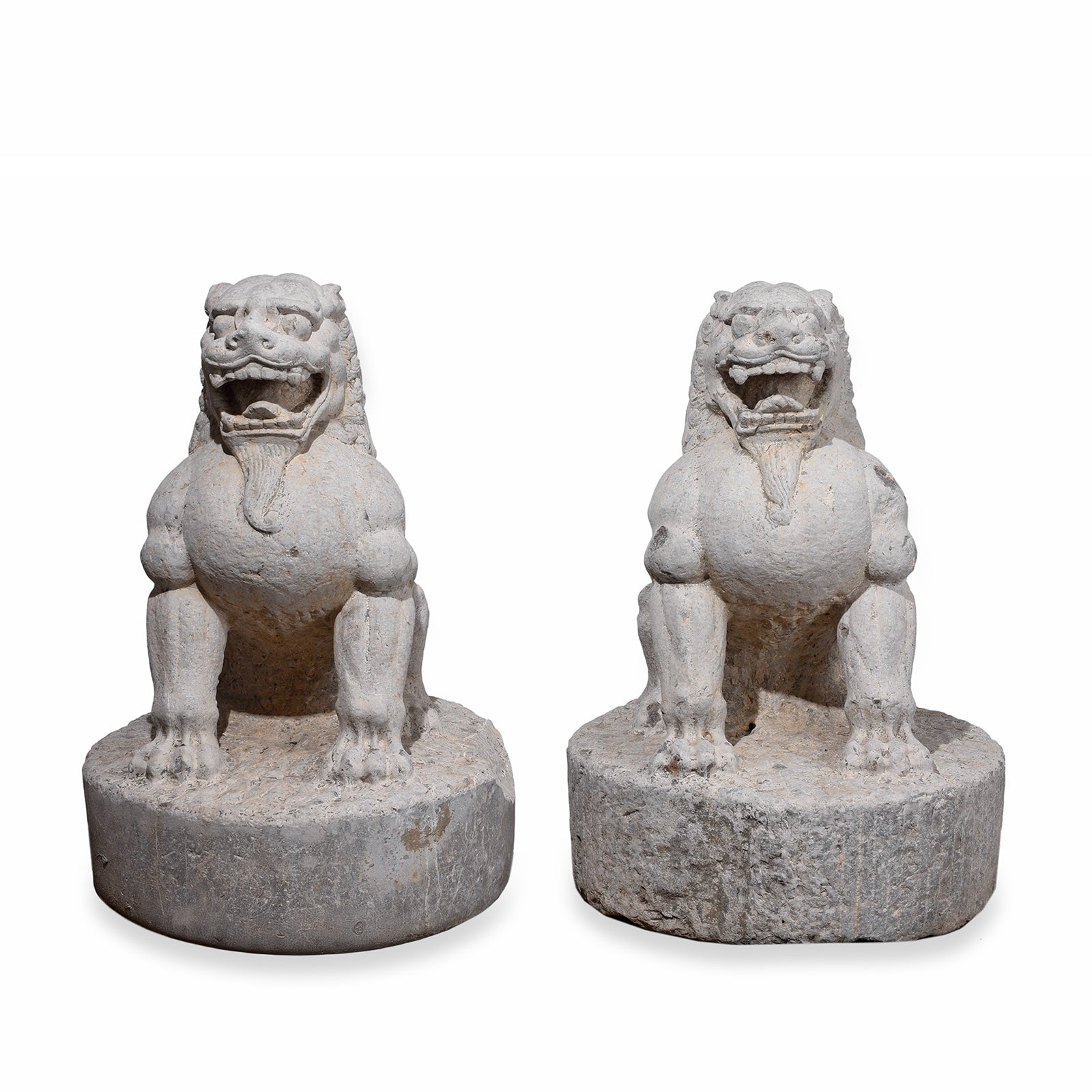 Powerful and full of character, this pair of Chinese stone guardian lions (石獅 Shishi) are finely carved examples of traditional entranceway protectors once stationed outside the homes of the wealthy to ward off evil spirits. With muscular stances, gaping jaws, and stylised manes, each figure reflects the long-standing symbolism of strength and guardianship in Chinese culture.