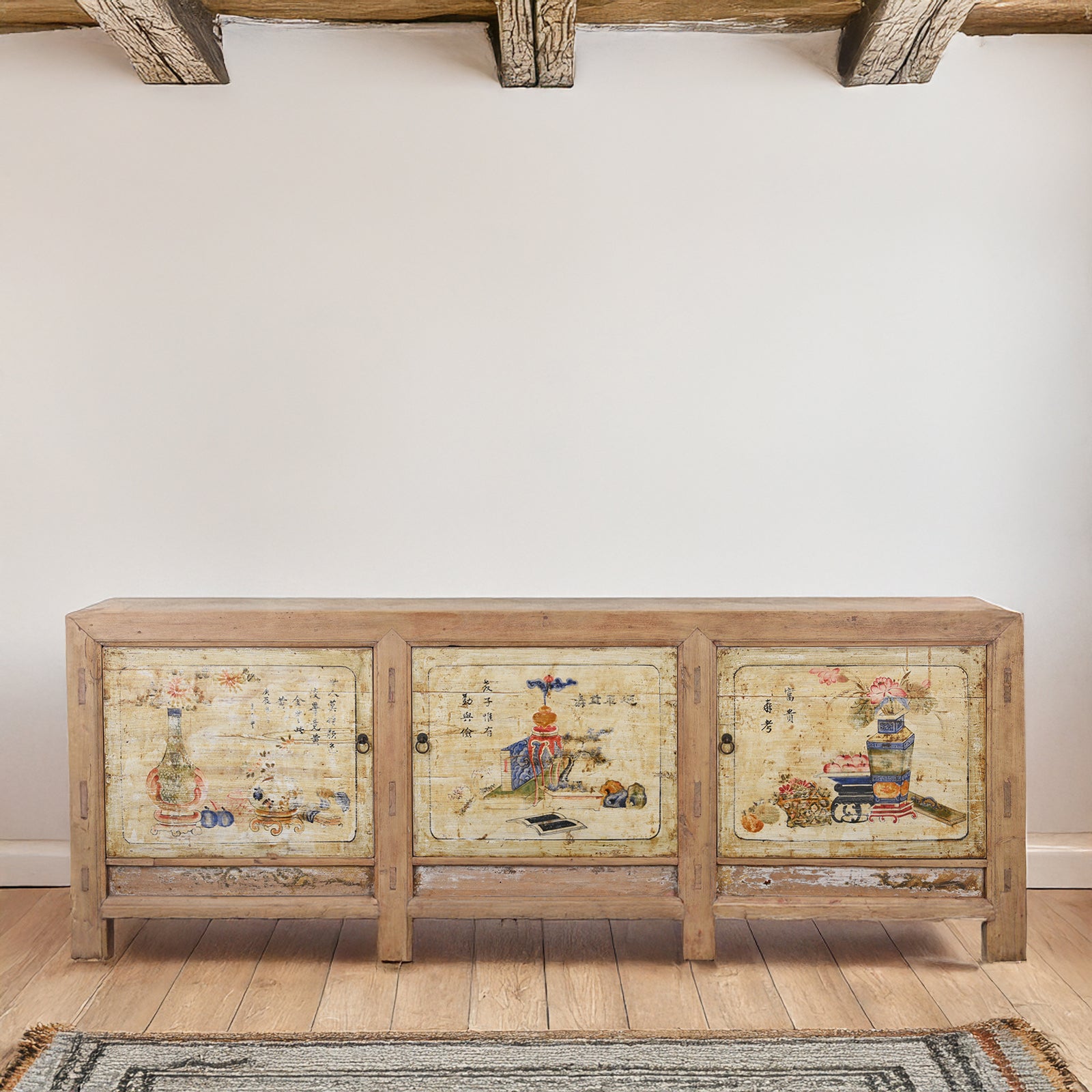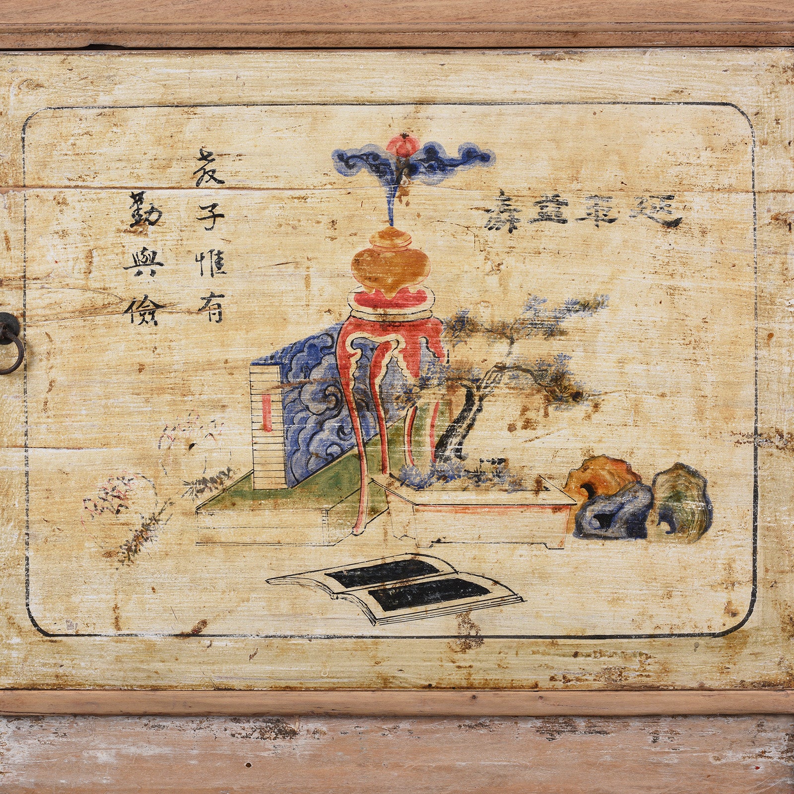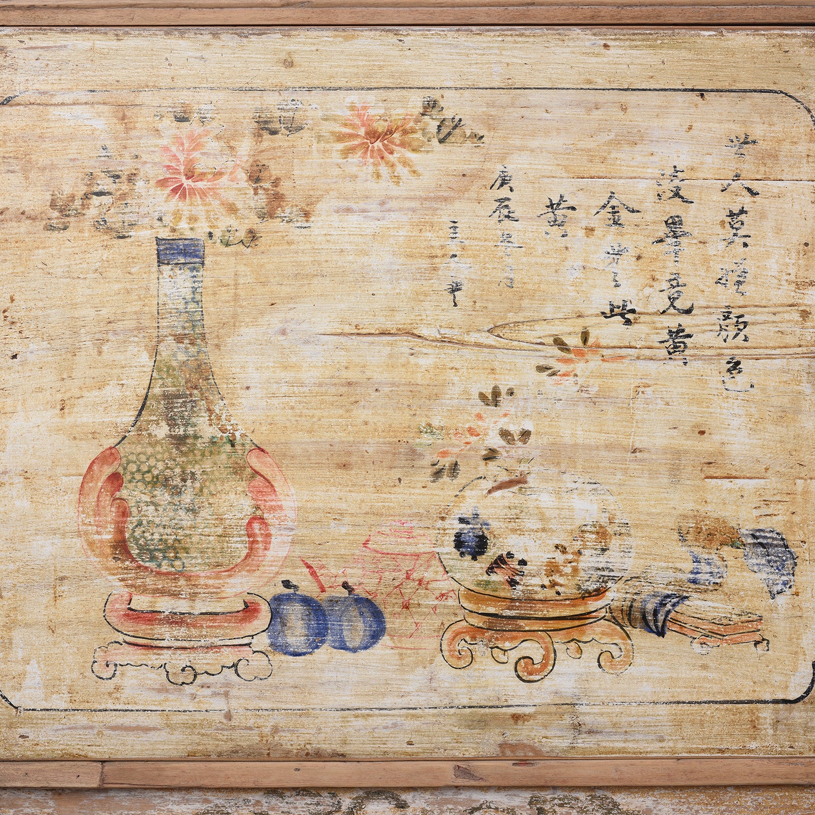 This exquisite 19th century sideboard is from the northern Shanxi province on the border of Mongolia. The cabinet shape is Mongolian in style, however the multi-panel painting on the doors is more Chinese, Shanxi style. The delicate hand painting features scholarly objects alongside floral arrangements.