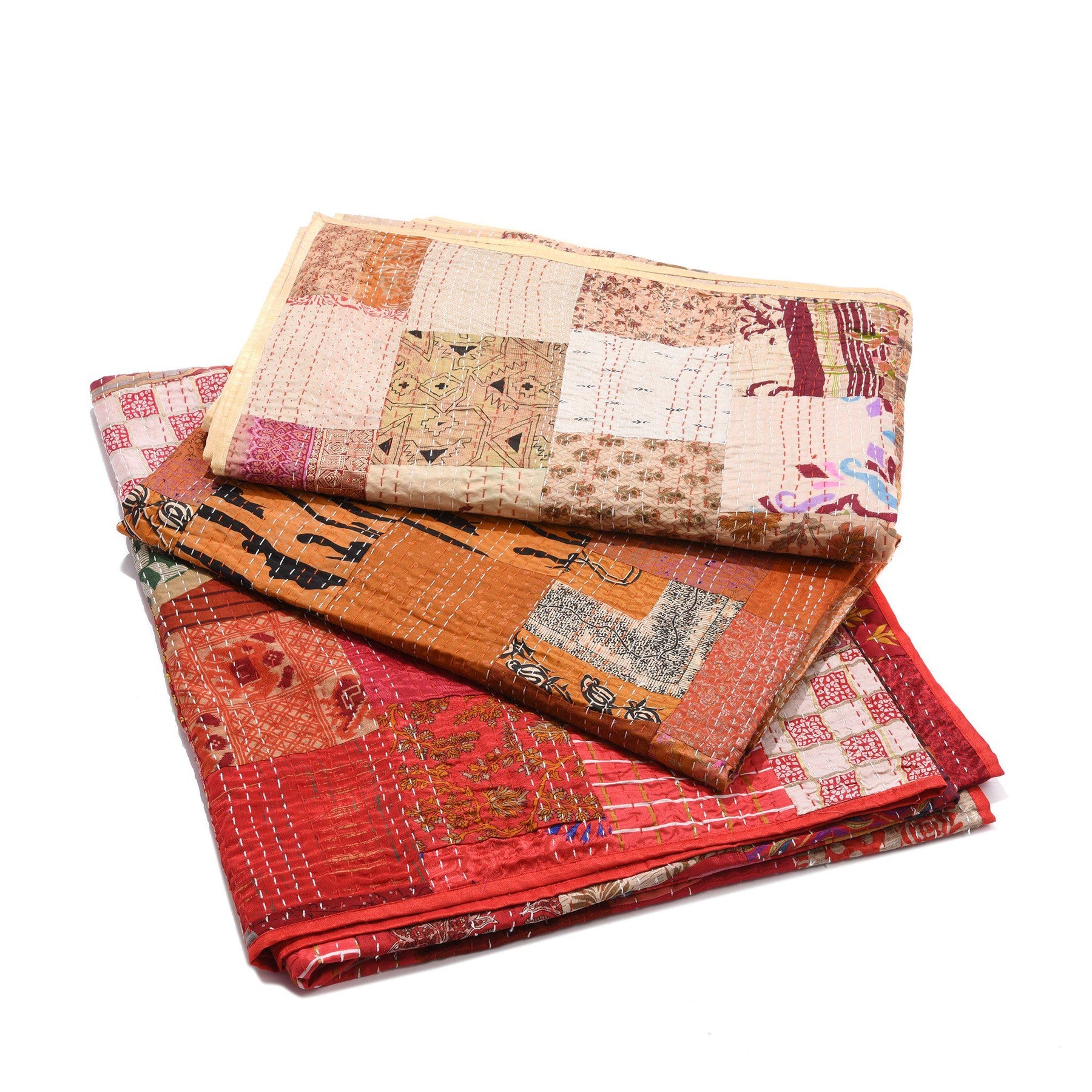 Kantha patchwork bedspread made from silk patola saris with a cotton backing.
