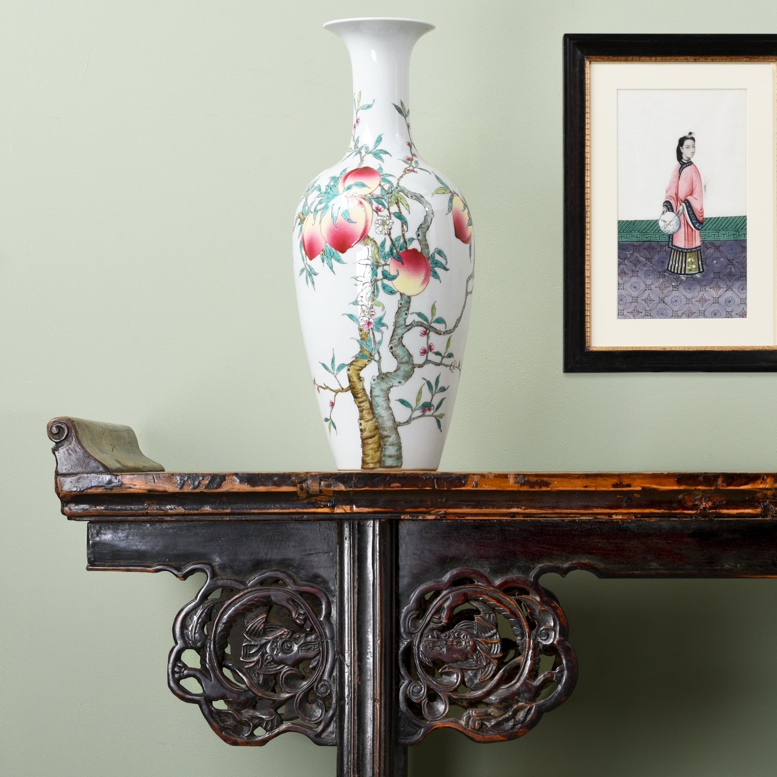 This reproduction Chinese porcelain vase is hand painted and made in the classic Chinese style. The "Five Peach" design depicting lucky peaches and lucky bats symbolises longevity and good luck.
