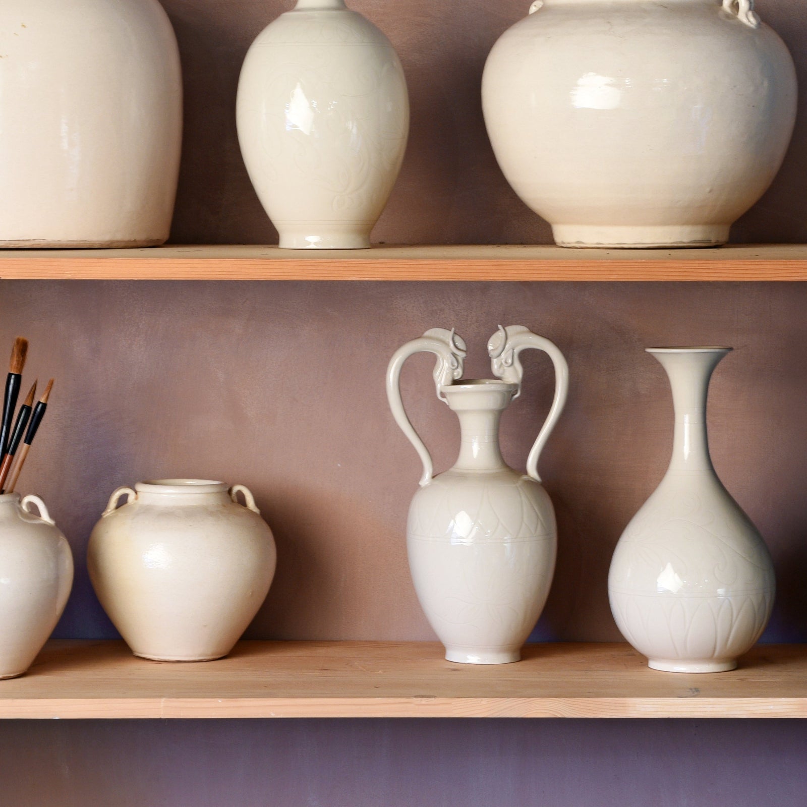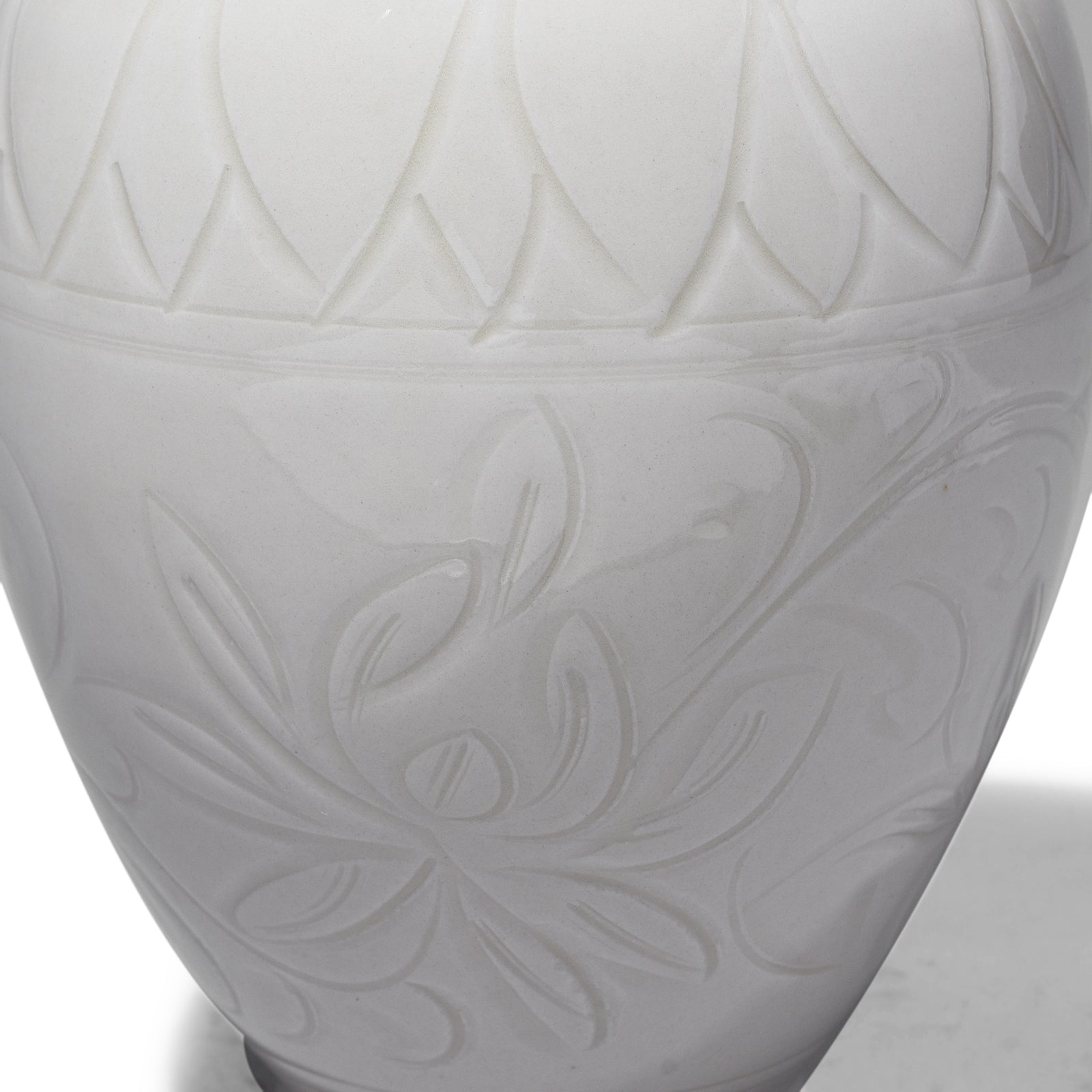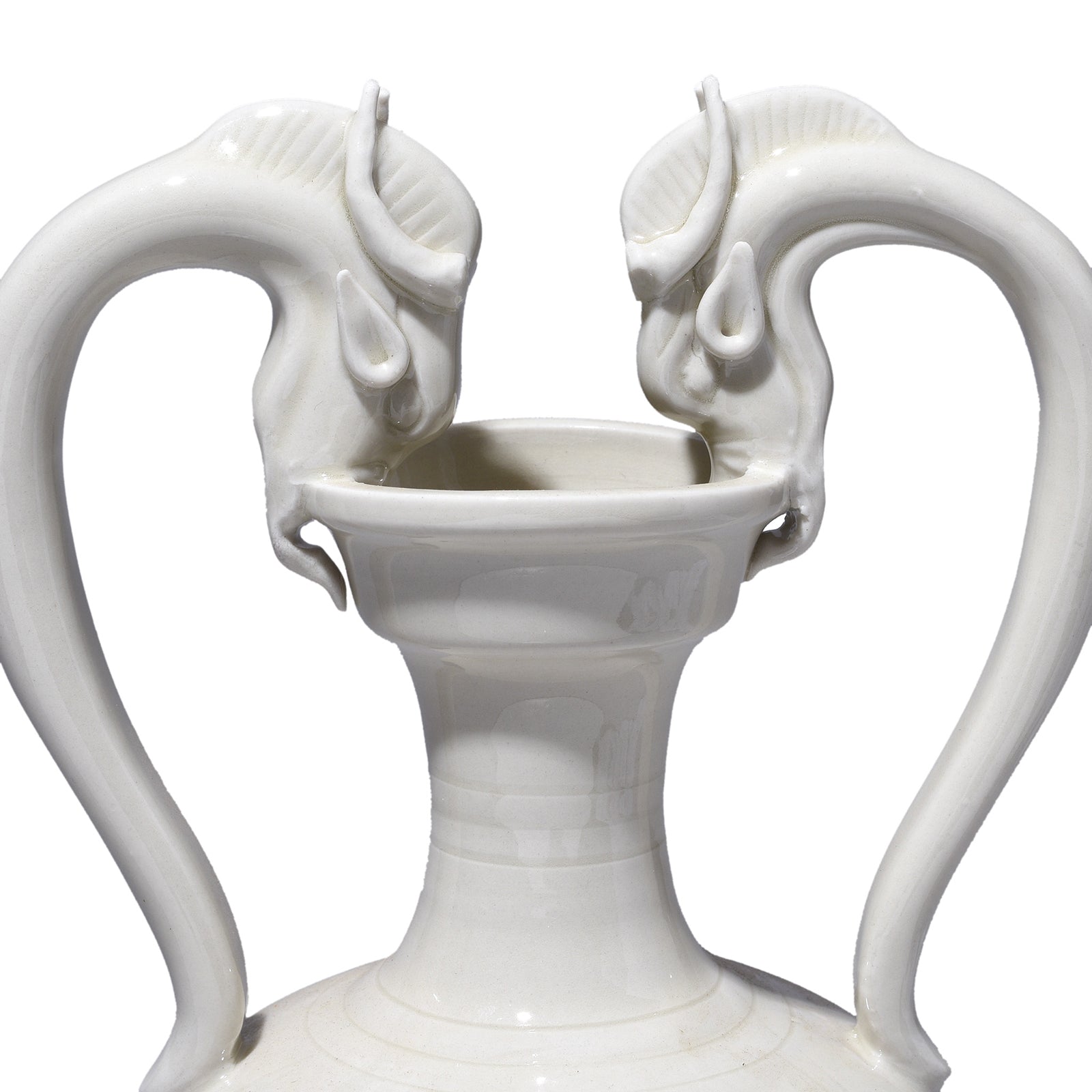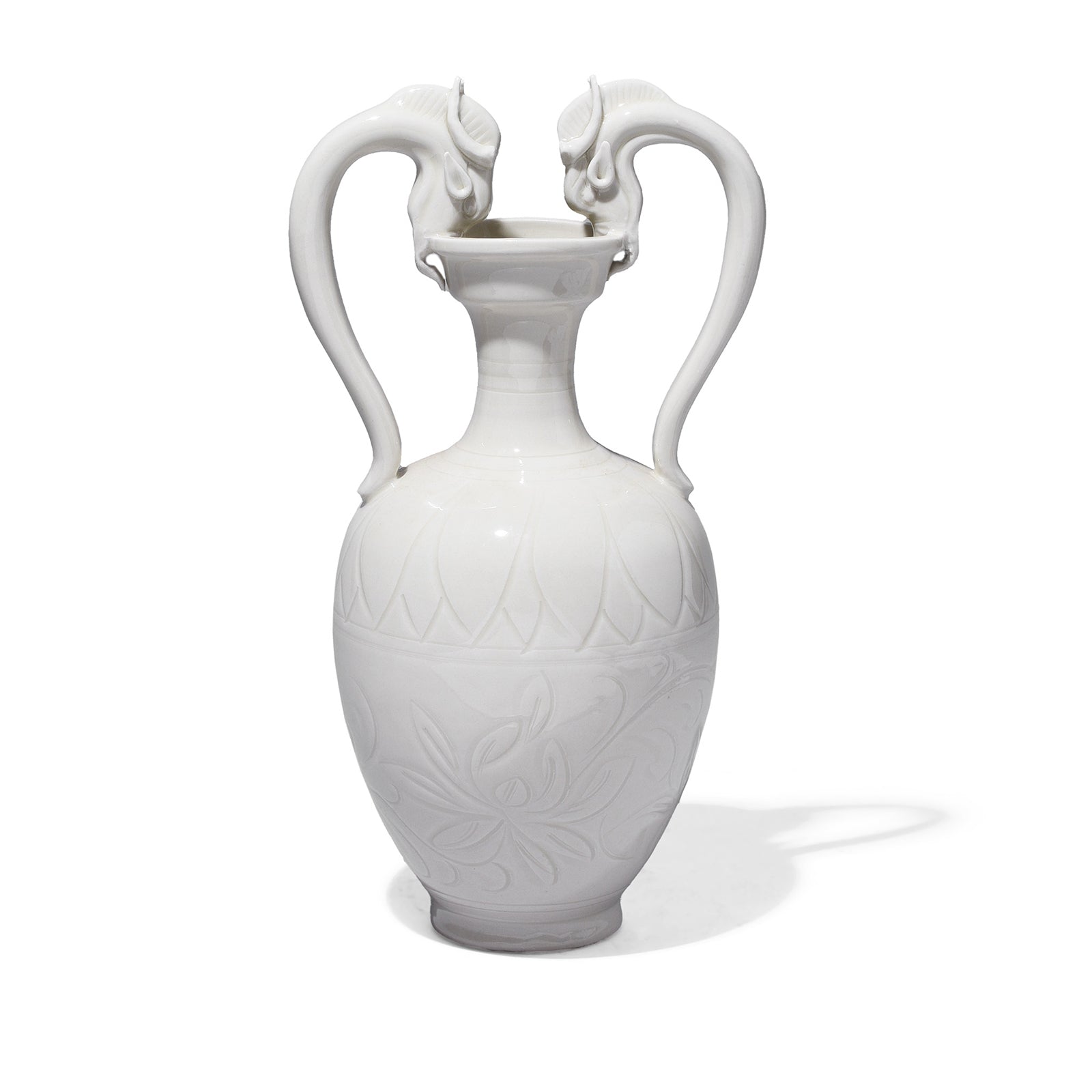 This beautiful vase is in the style of the Ding ware of the Song Dynasty (960 to 1279 AD). Dingware was made in Hebei province and at the time was considered to be some of the finest porcelain produced in China These reproduction porcelain vases are made by hand in Jingdezhen. The form imitates examples found in museums and this is a great decorative vase.
