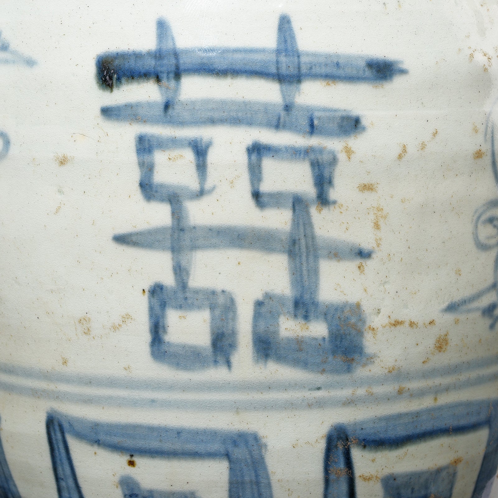 This reproduction Chinese blue & white vase is made in the late Ming style and features a 'double happiness' symbol. It is hand painted by skilled artists using traditional techniques learned from their family passed down through generations.