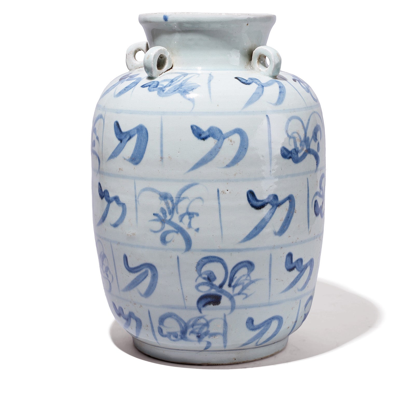 This provincial-style blue and white calligraphy porcelain jar is a finely made reproduction inspired by late Ming dynasty ceramic traditions. Hand painted by skilled artisans using brush techniques passed down through generations, the surface is decorated with expressive calligraphic characters arranged in rhythmic registers, reflecting the more spontaneous and painterly quality associated with provincial wares.