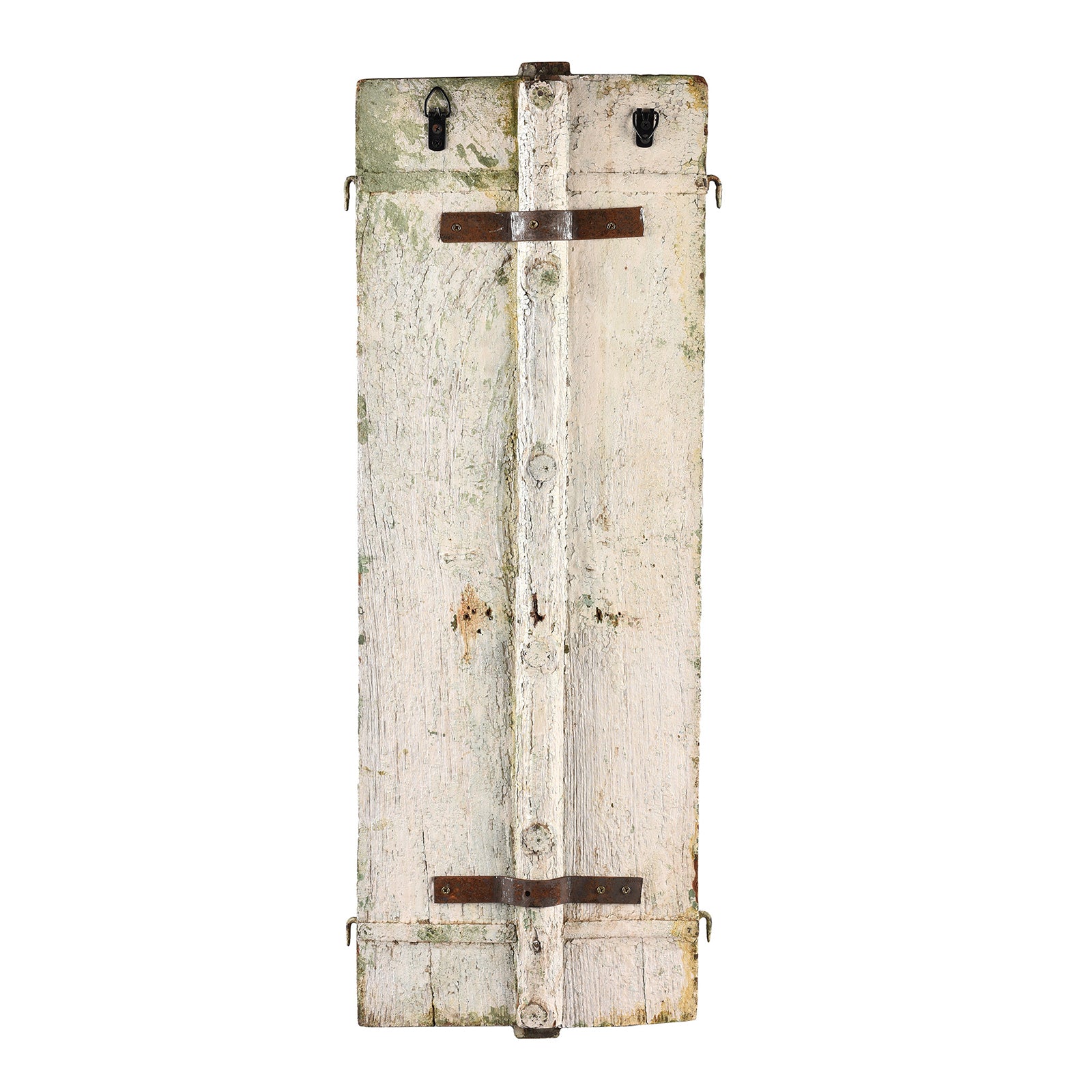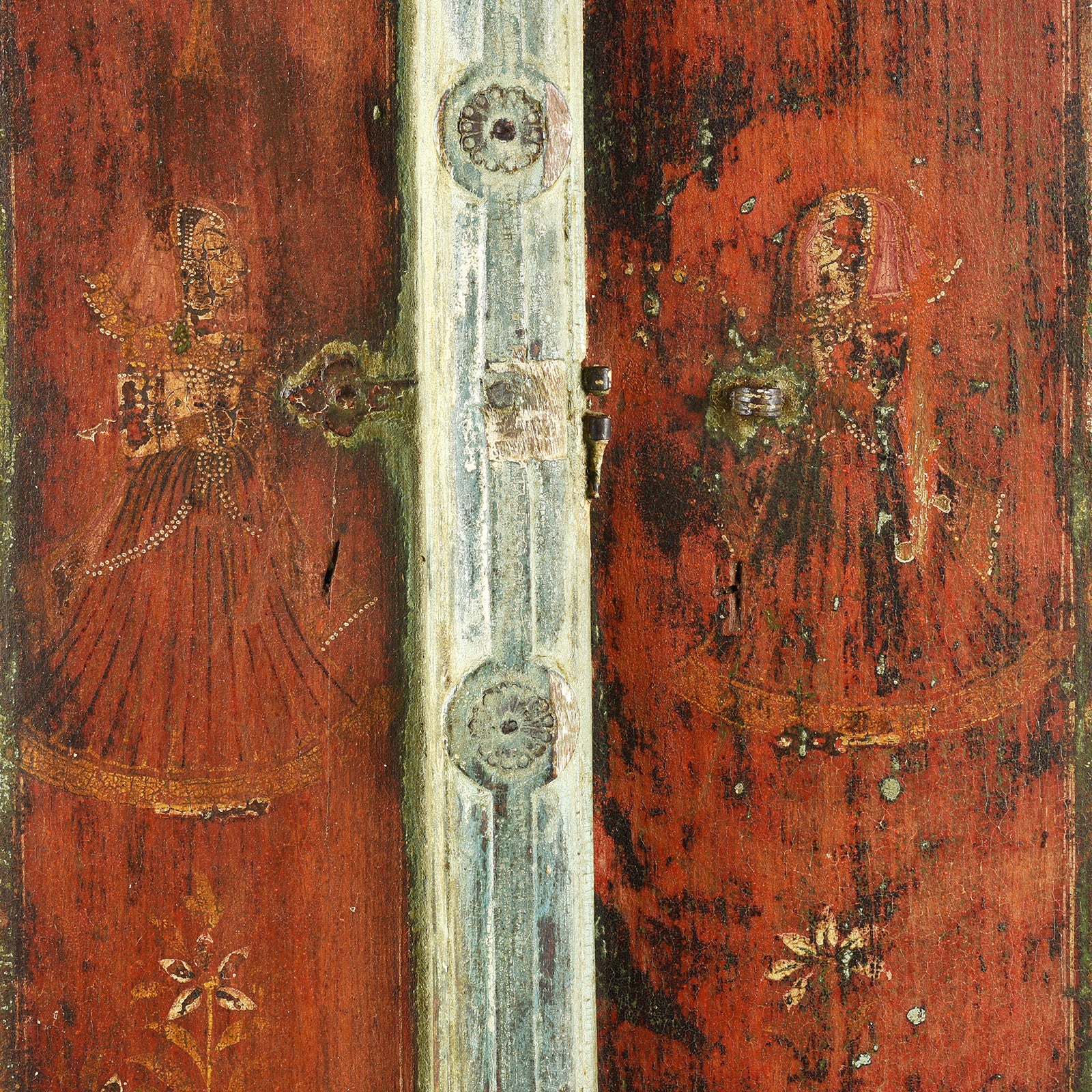 Experience the exceptional craftmanship of Rajasthan with these antique painted window shutters. Two female attendants dressed in traditional attire face one another on this dramatic green and red window shutter. The deep red and lush green colours evoke the vibrant and dynamic nature of Rajasthan renowned artwork. Similar painting can be found in Jodhpur's historic Mehrangarh Fort.