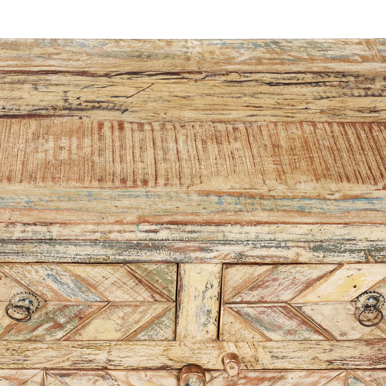 This sideboard is not an antique, instead, it is made from reclaimed teak wood salvaged from old buildings in Rajasthan and Gujarat. It is decorative, extremely durable, and environmentally friendly. It has a distressed paint finish across its parquet panel design