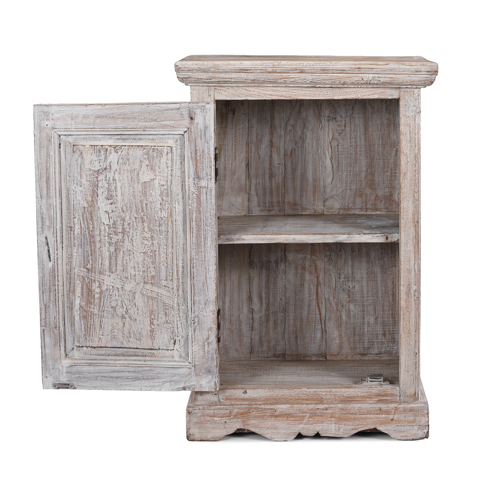 This charming Indian bedside cabinet has been crafted using reclaimed carved teak panels and salvaged teak wood sourced from old buildings in Rajasthan and Gujarat. Though not an antique, it retains a wonderfully aged, timeworn character, celebrating the natural texture and patina of old timber. The door is decorated with traditional carved detailing, while the interior features a practical fitted shelf, perfect for storage beside a bed or in a living space.