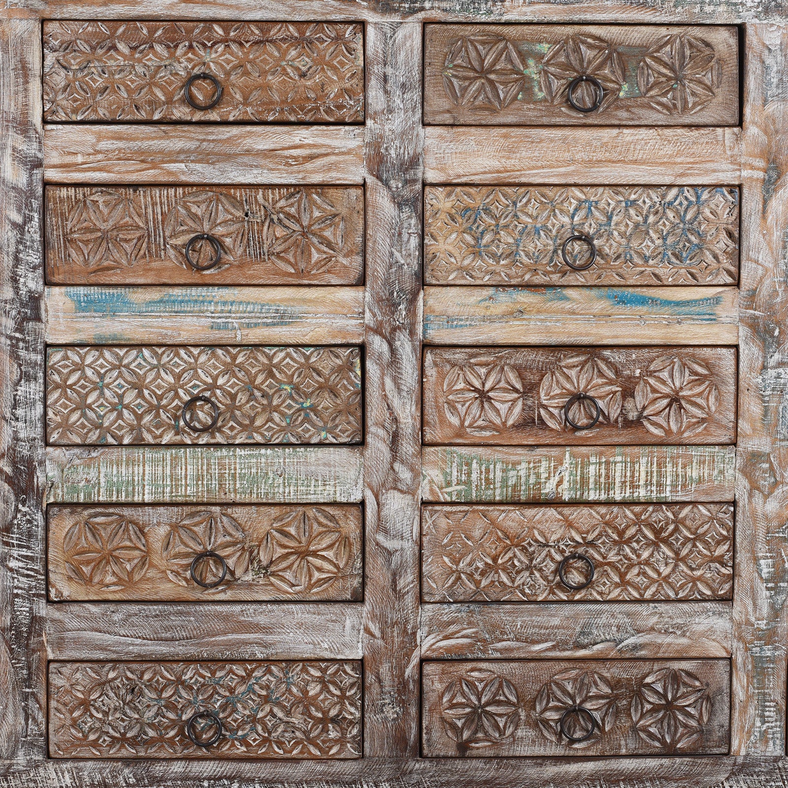The chest features an impressive arrangement of twenty drawers, each individually carved with deep, bold detailing and finished in a distressed paint patina. The repetition of carved fronts creates a strong visual rhythm, making this piece as much a statement object as it is practical furniture. Extremely durable and environmentally friendly, it works equally well as a sideboard in a dining space or as a chest of drawers in a bedroom or hallway.